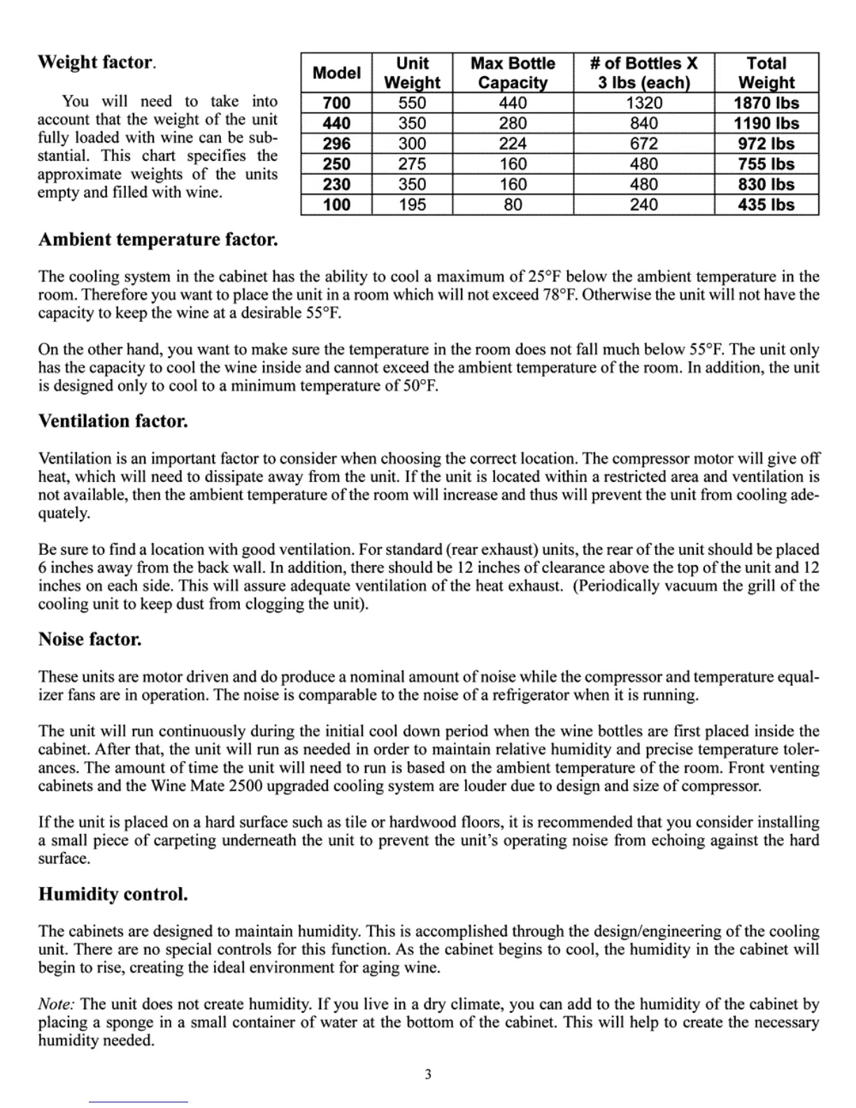 Vinotemp 100 - Cabinet Placement Factors; Weight Factor; Ambient Temperature Factor; Ventilation Factor