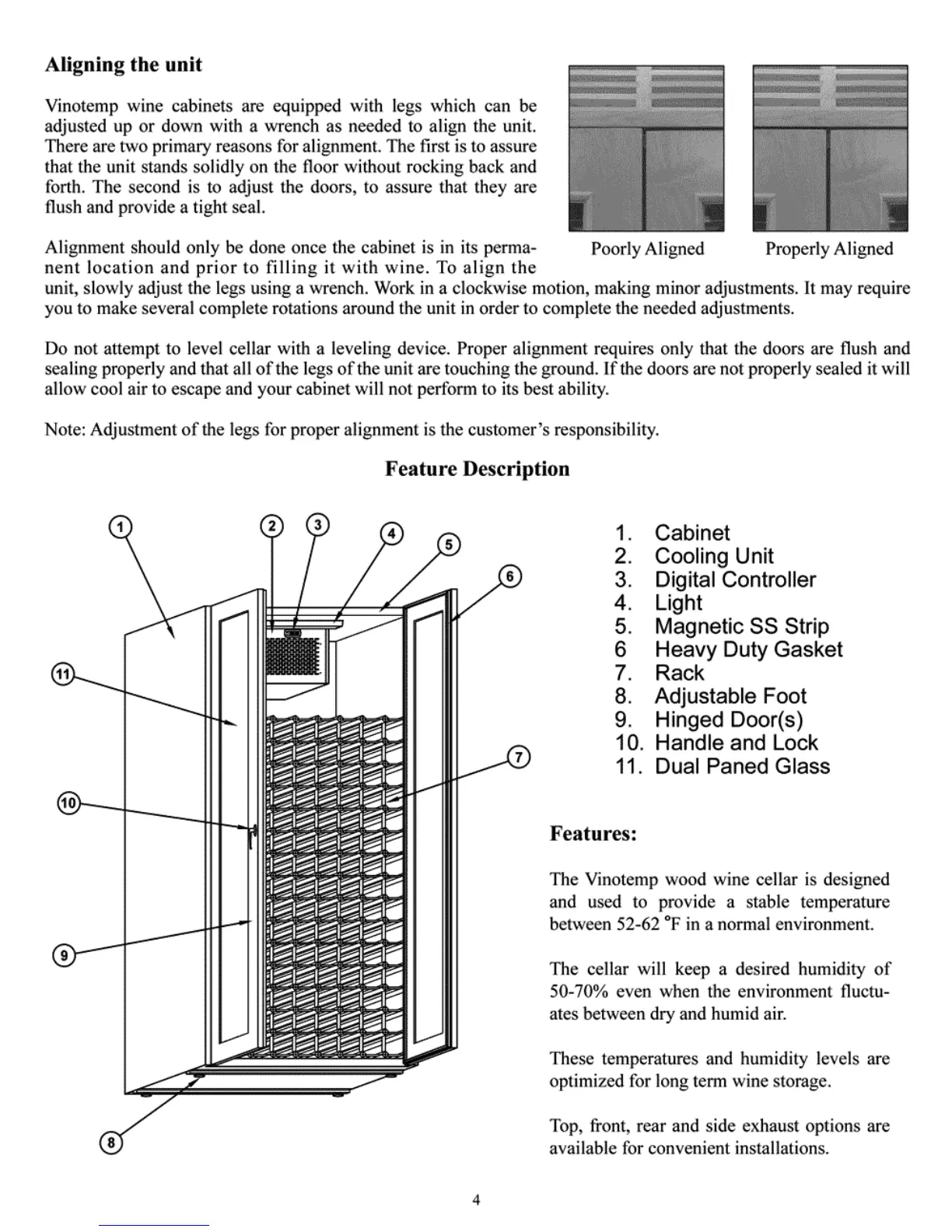 Vinotemp 100 - Cabinet Alignment and Features; Aligning the Unit; Feature Description