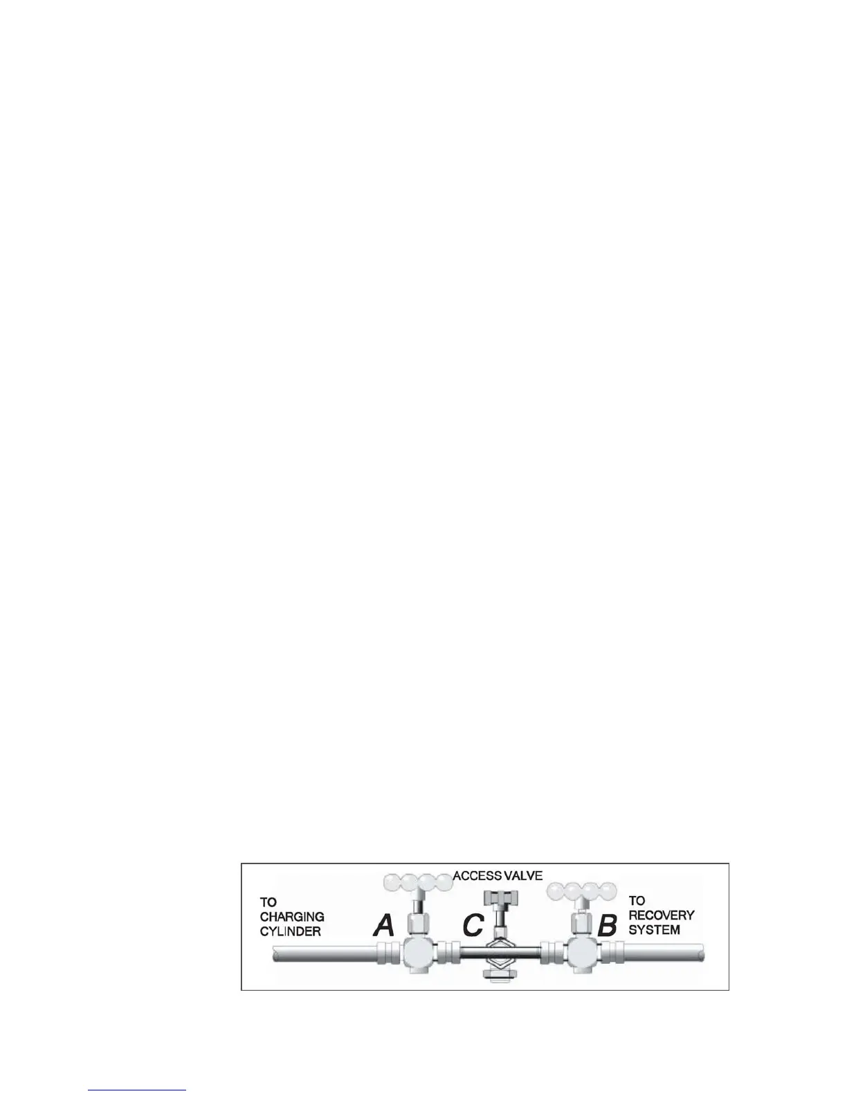to flare tee, hand valve (A) to charging cylinder, hand valve (B) to recovery system.