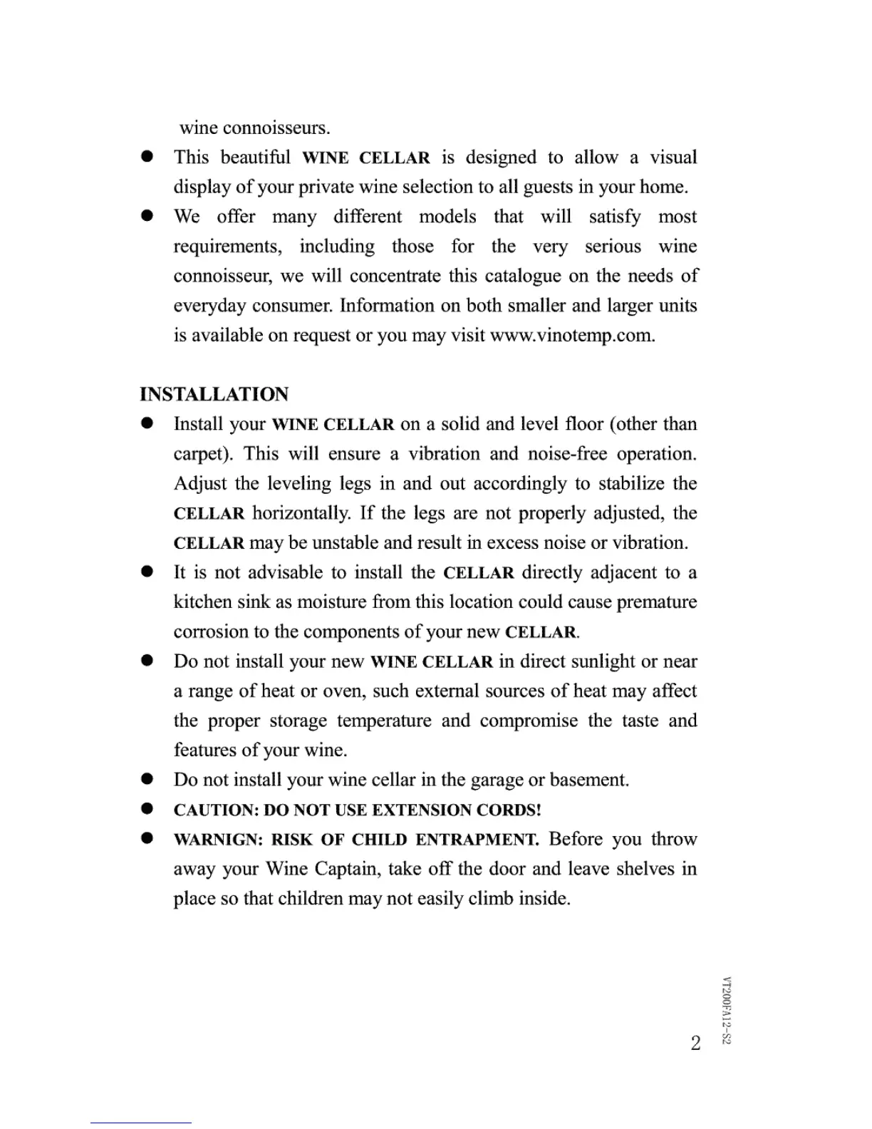 Vinotemp VT-182 - Installation; Installation Location and Safety Precautions