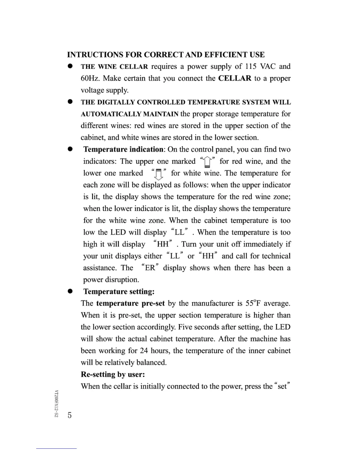 Vinotemp VT-182 - Instructions for Correct and Efficient Use; Temperature Indication and Error Codes; Temperature Setting and Adjustment