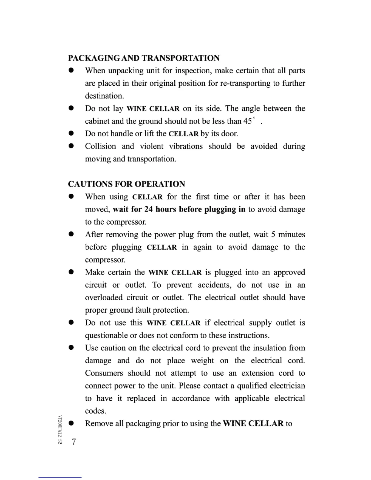 Vinotemp VT-182 - Packaging and Transportation; Cautions for Operation