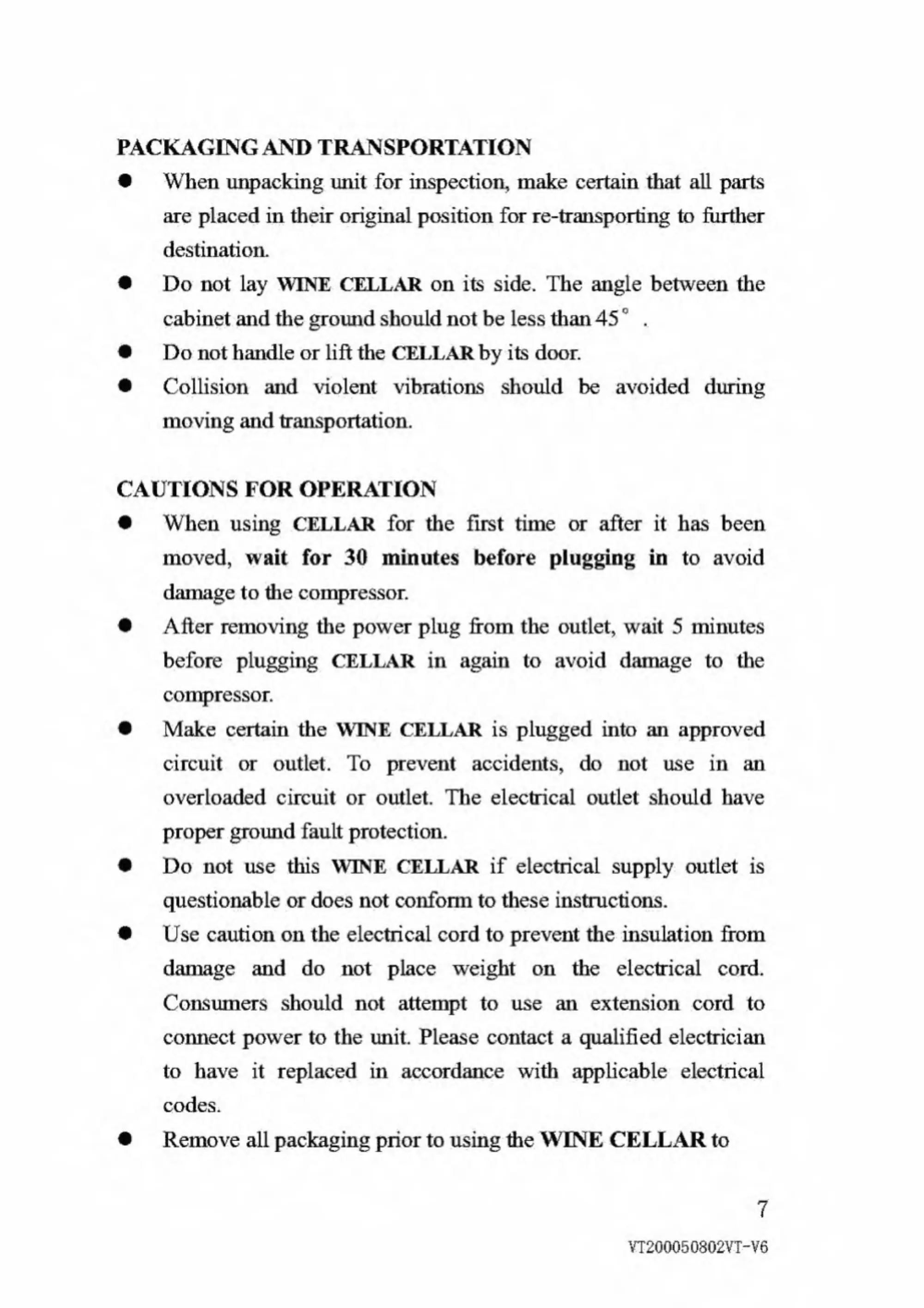 Vinotemp VT200 - Packaging and Transportation.7; Cautions for Operation.7