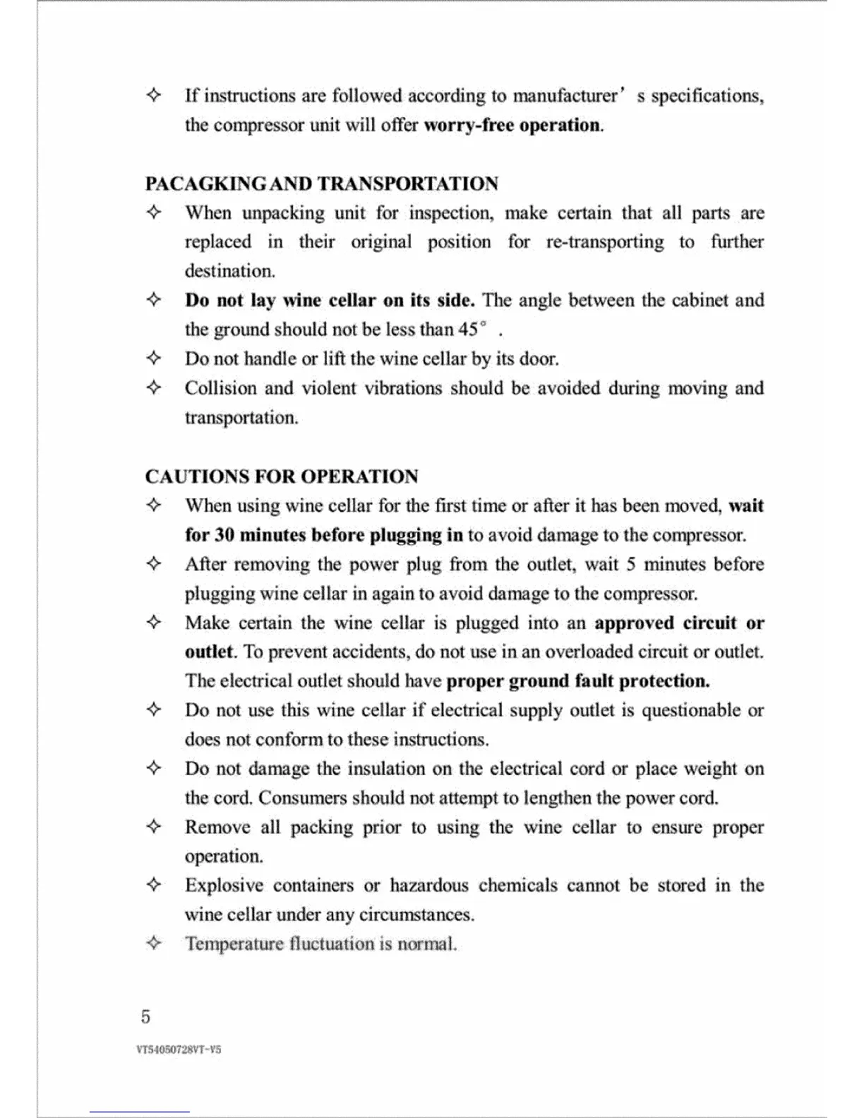 Vinotemp VT60 - Packaging and Transportation; Operational Cautions