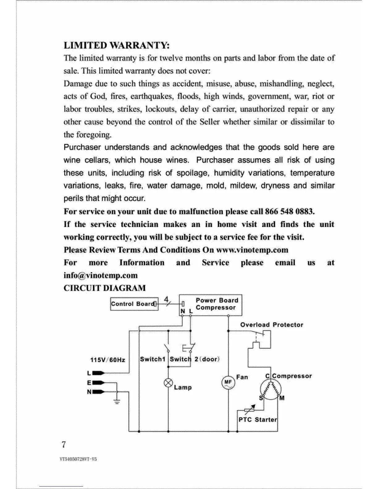 Vinotemp VT60 - Limited Warranty Information; Circuit Diagram