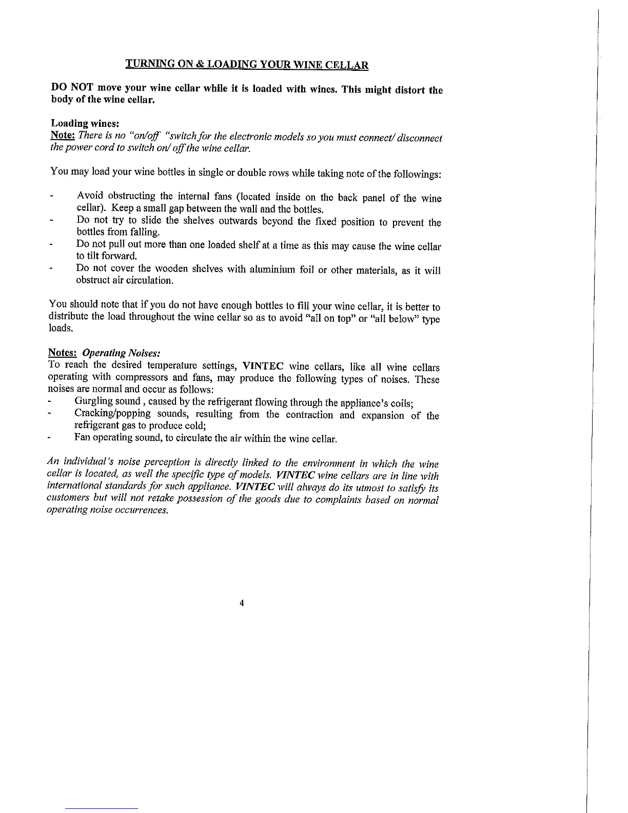 Vintec V30 - TURNING ON & LOADING YOUR WINE CELLAR; Loading Wine Bottles; Understanding Normal Operating Noises