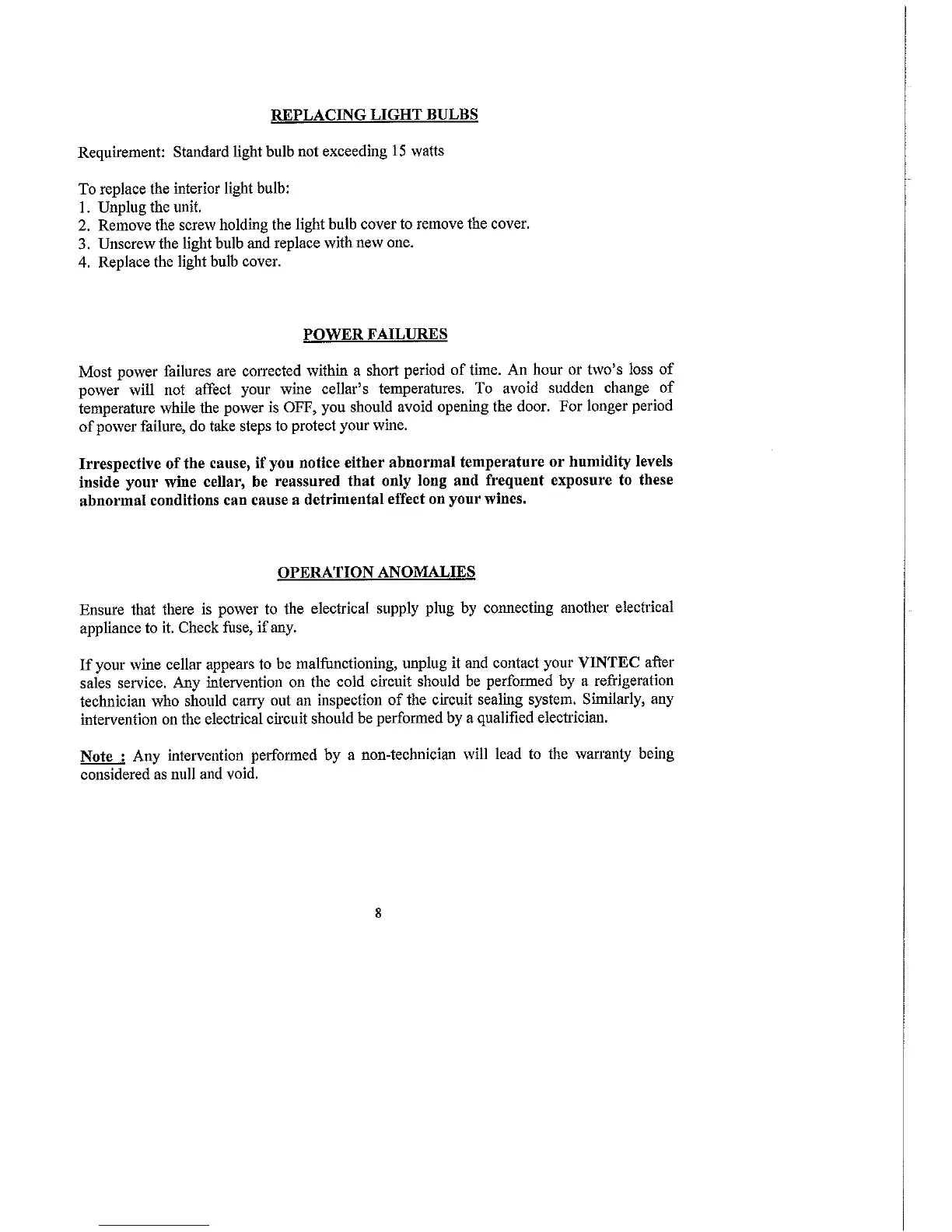 Vintec V30 - REPLACING LIGHT BULBS; Interior Light Bulb Replacement Procedure; POWER FAILURES; Impact of Power Outages on Wine Cellar