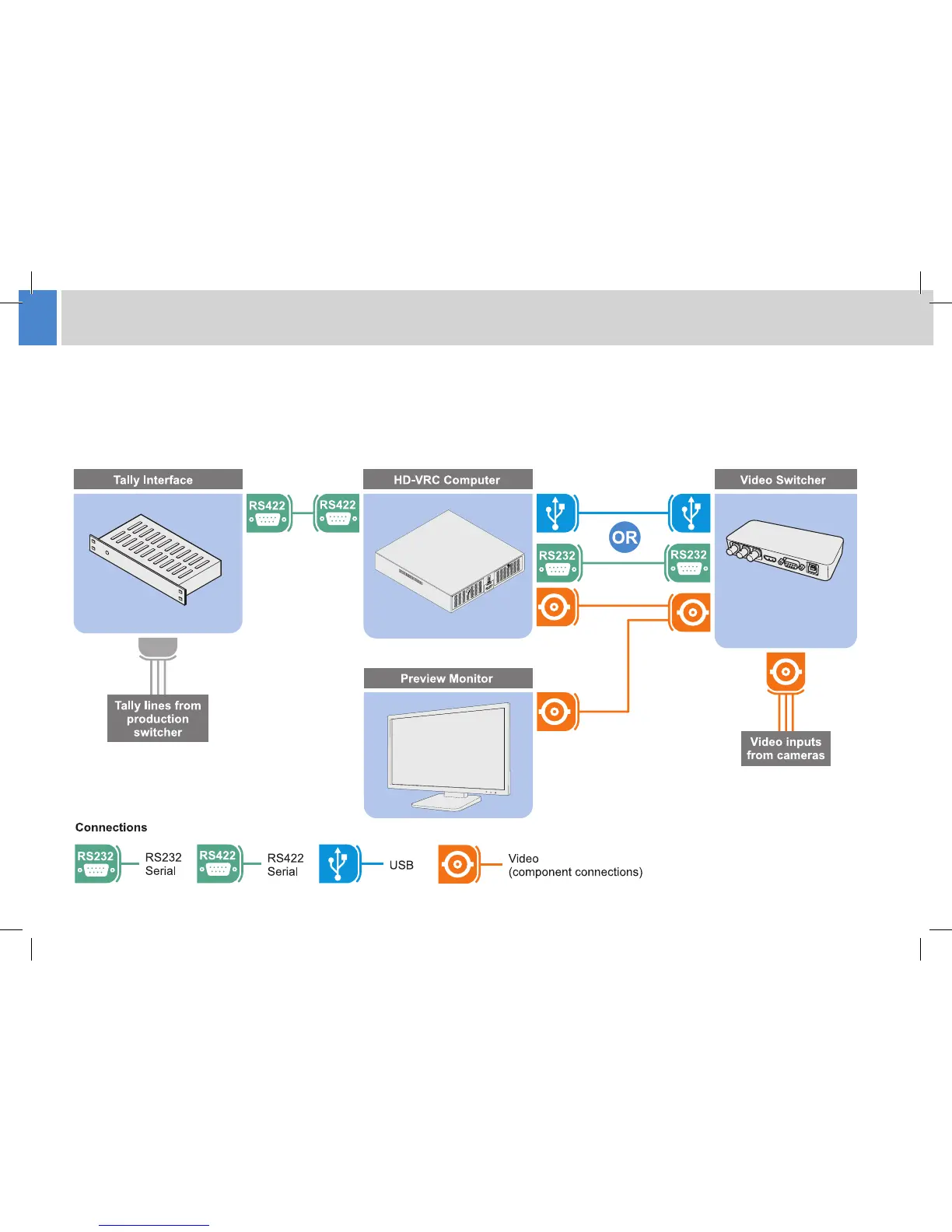 In a typical HD-VRC control system installation, a video switcher and tally interface are also connected to provide live on-air camera feeds for