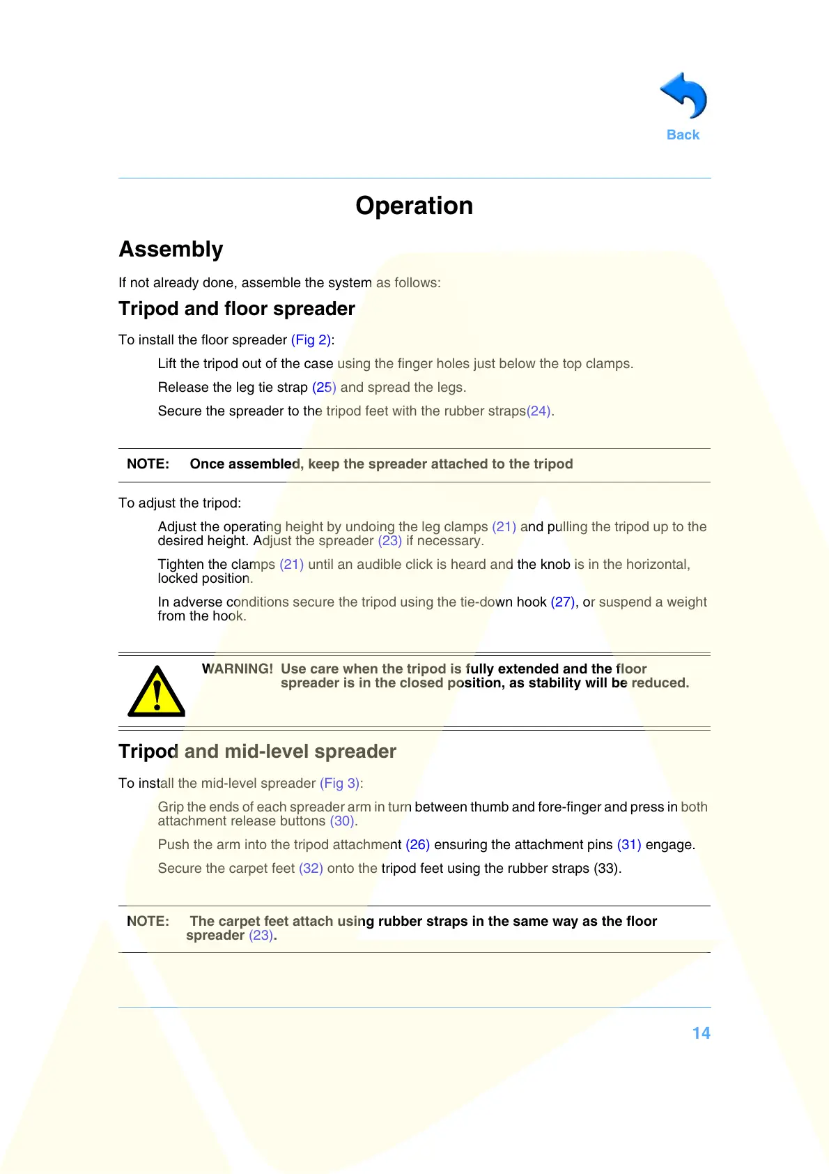 Adjust the operating height by undoing the leg clamps (21) and pulling the tripod up to the