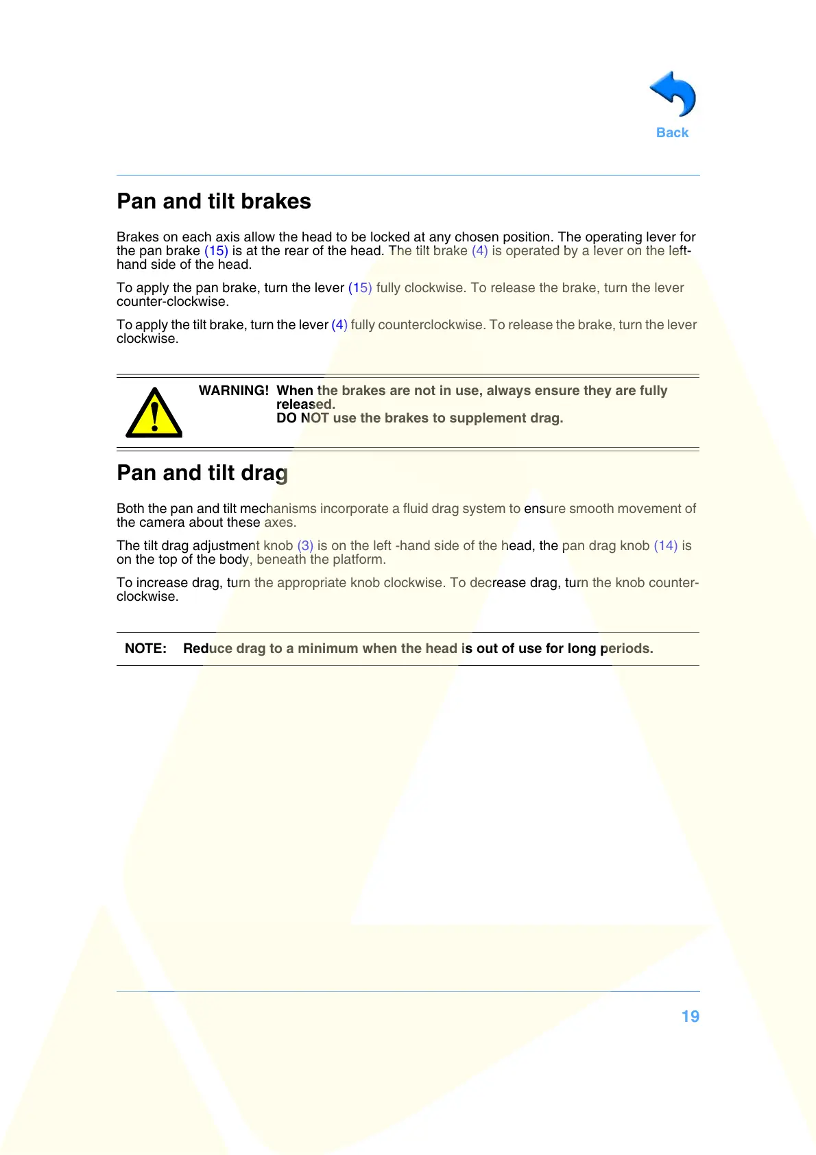 To apply the pan brake, turn the lever (15) fully clockwise. To release the brake, turn the lever