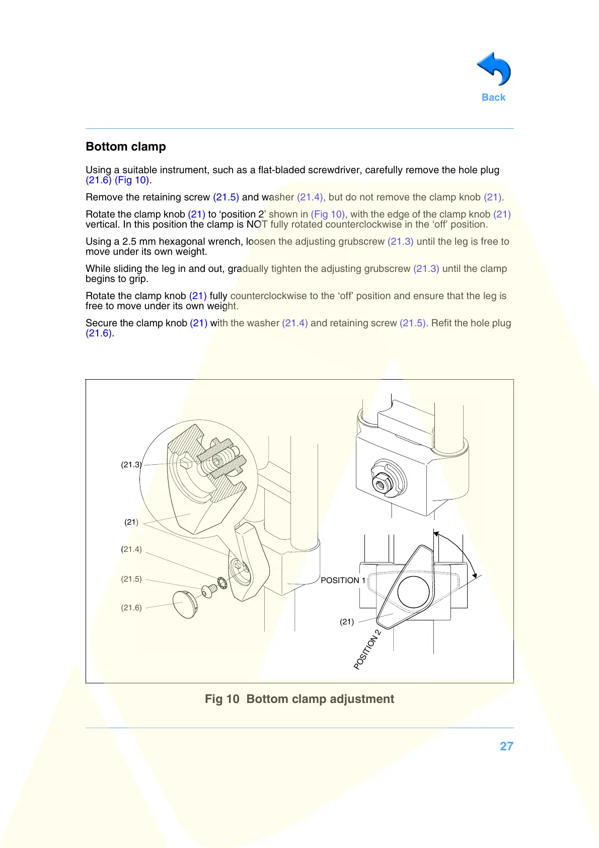 Rotate the clamp knob (21) fully counterclockwise to the ‘off’ position and ensure that the leg is