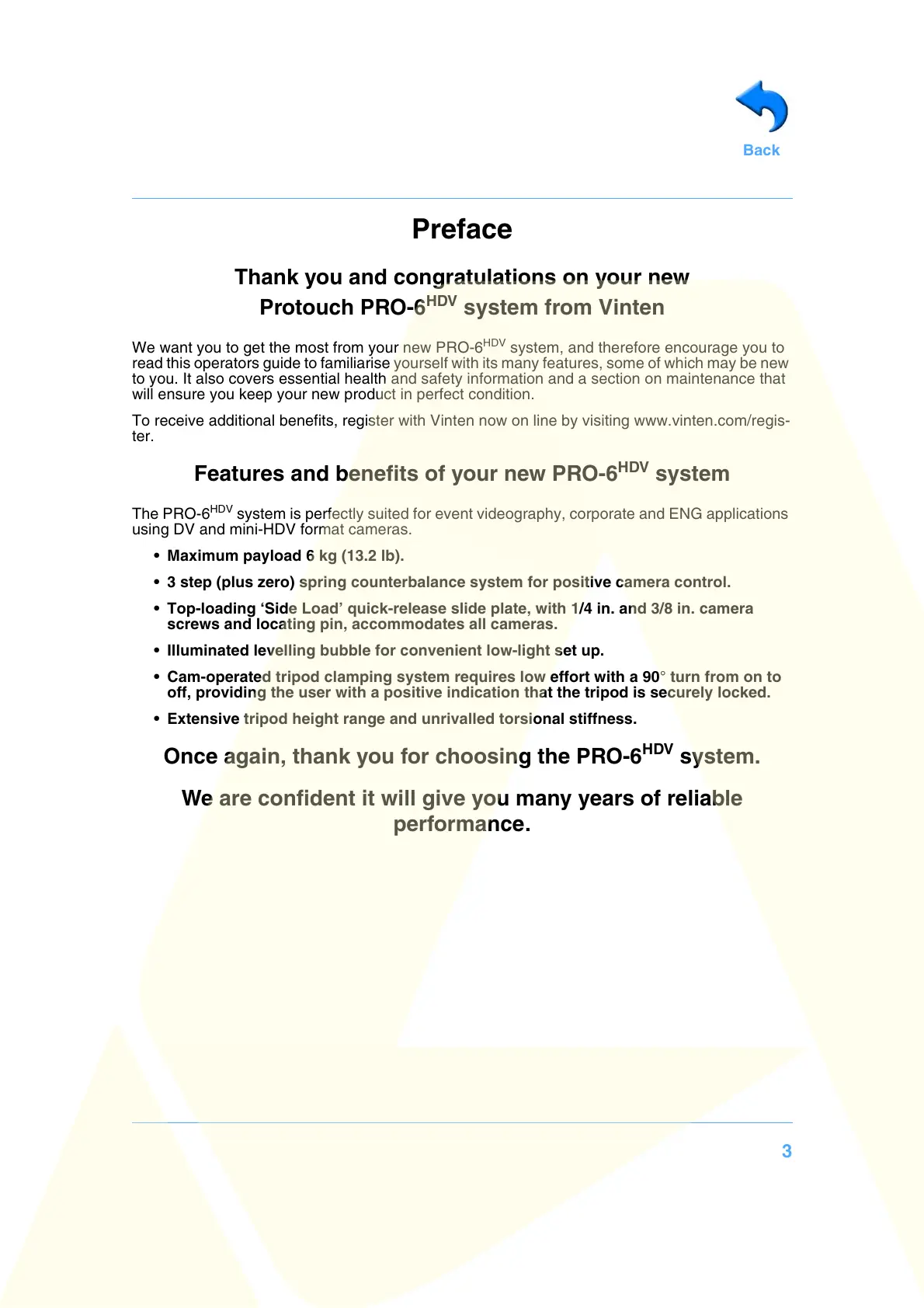 To receive additional benefits, register with Vinten now on line by visiting www.vinten.com/regis-