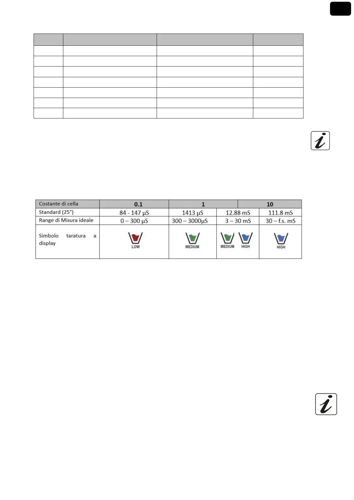 The following table relates the cell constant of the sensor with the measurement range and the standard