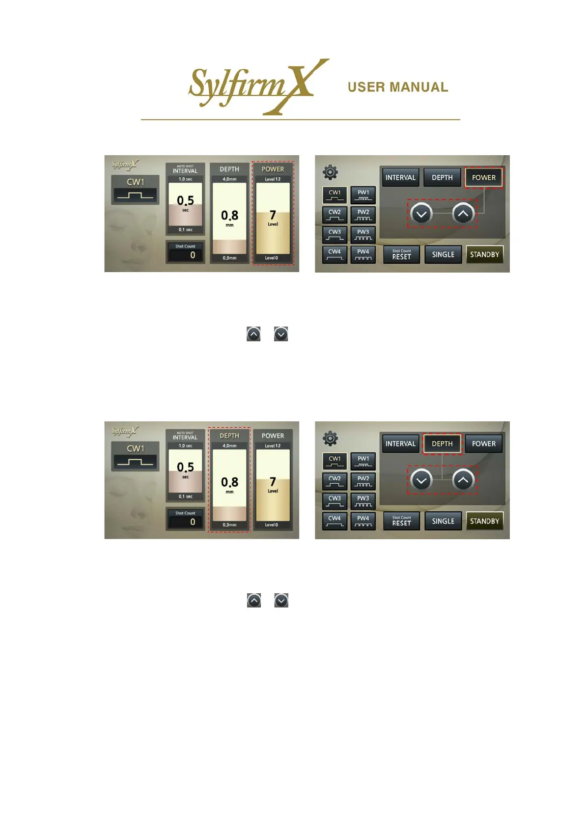 - Press the Up and Down arrows / buttons on the lower LCD to adjust the POWER level. Press