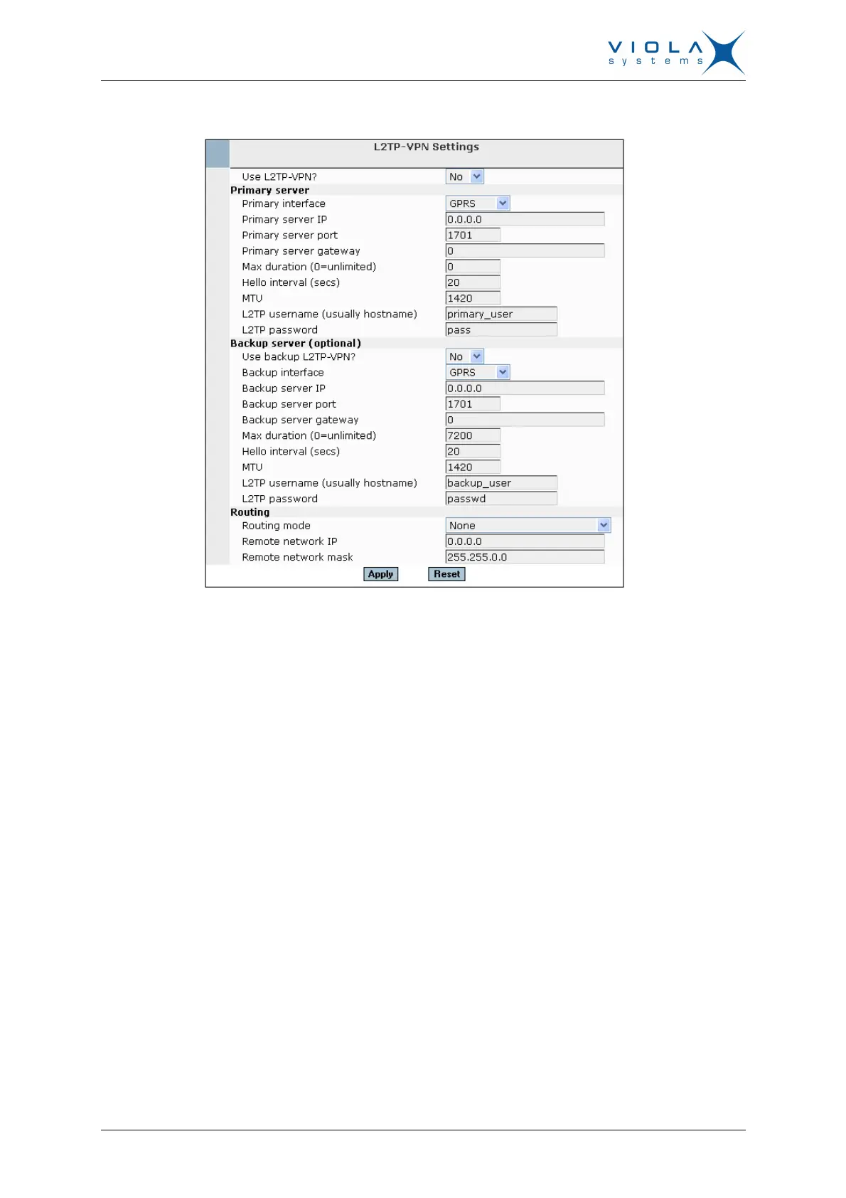 Primary server IP – IP address of Viola M2M Gateway L2TP server.
