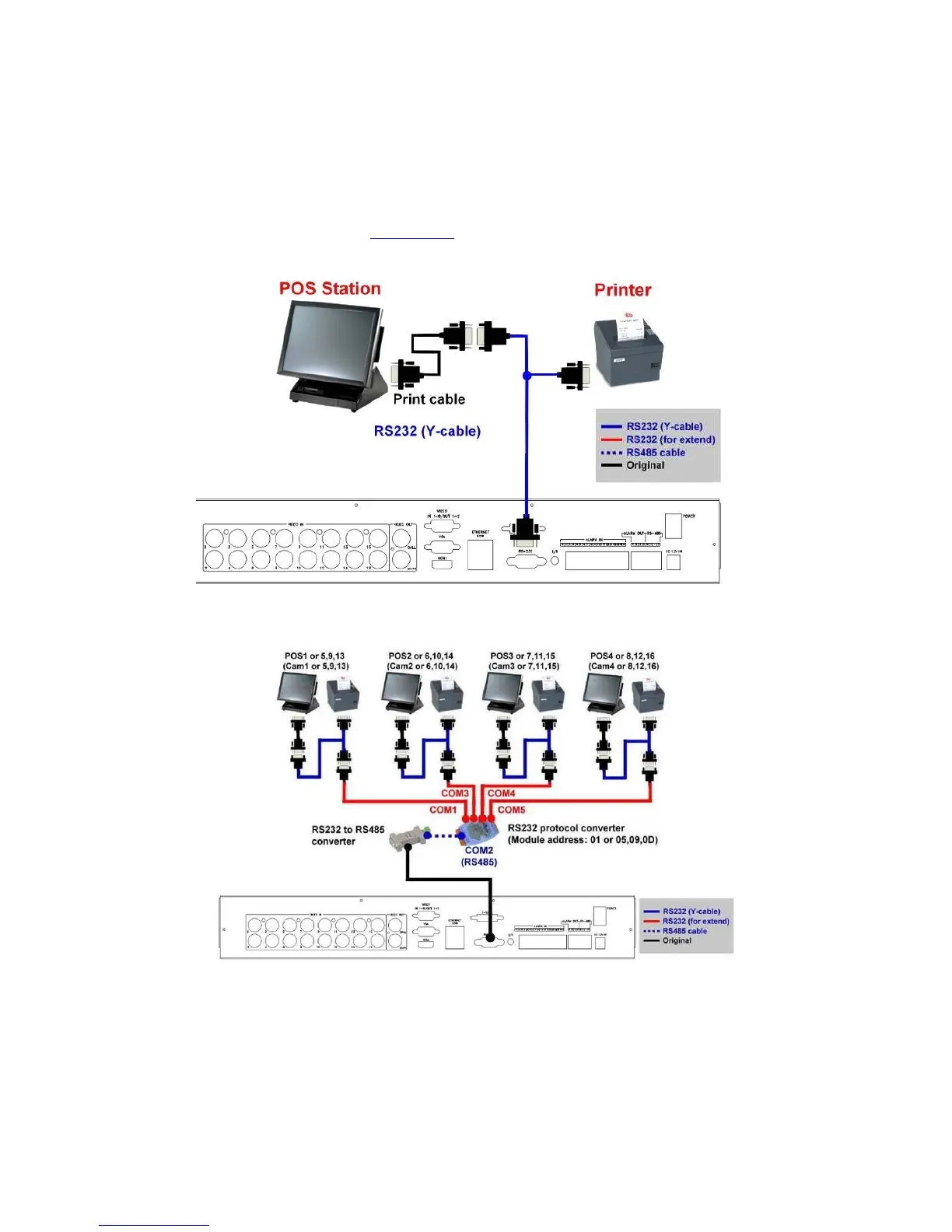 Top figure: 1-to-1; bottom figure: RS-232/Multiple, 1-to-many