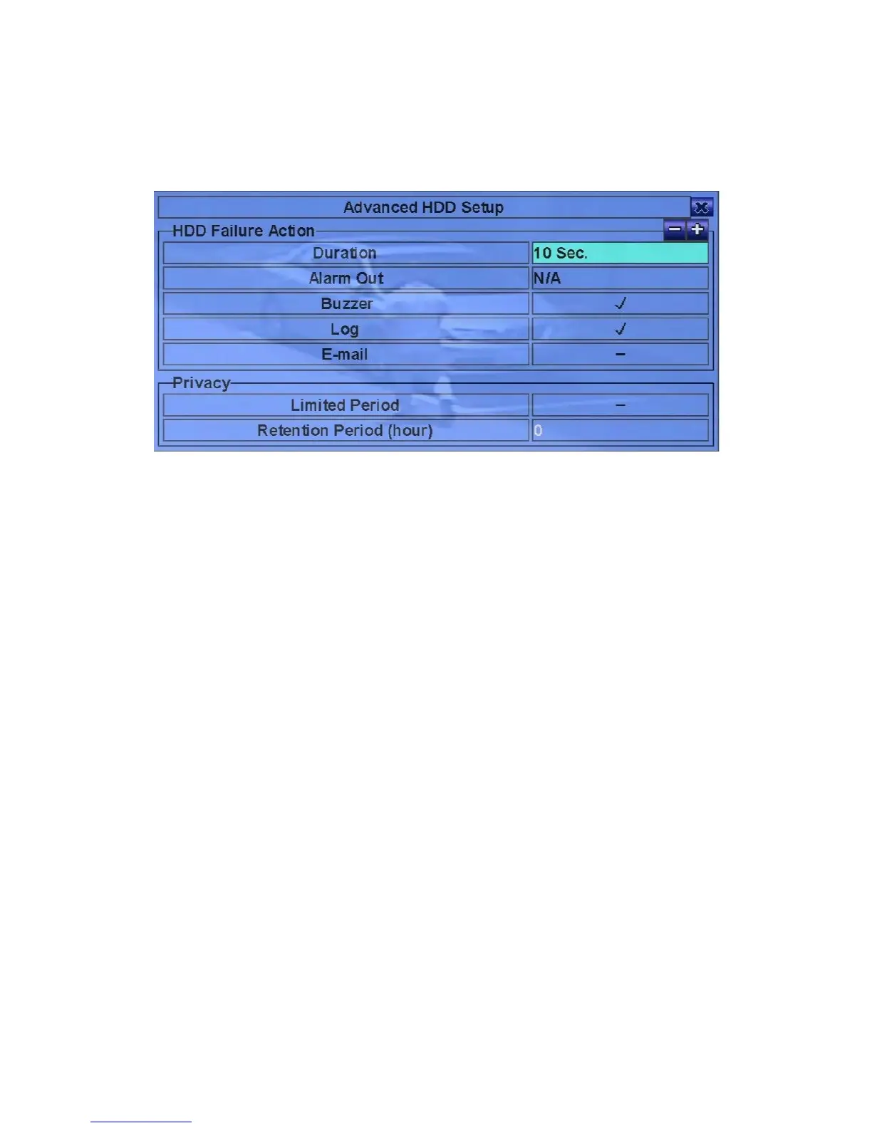 how the system responds to the detected HDD failure, while the Privacy settings