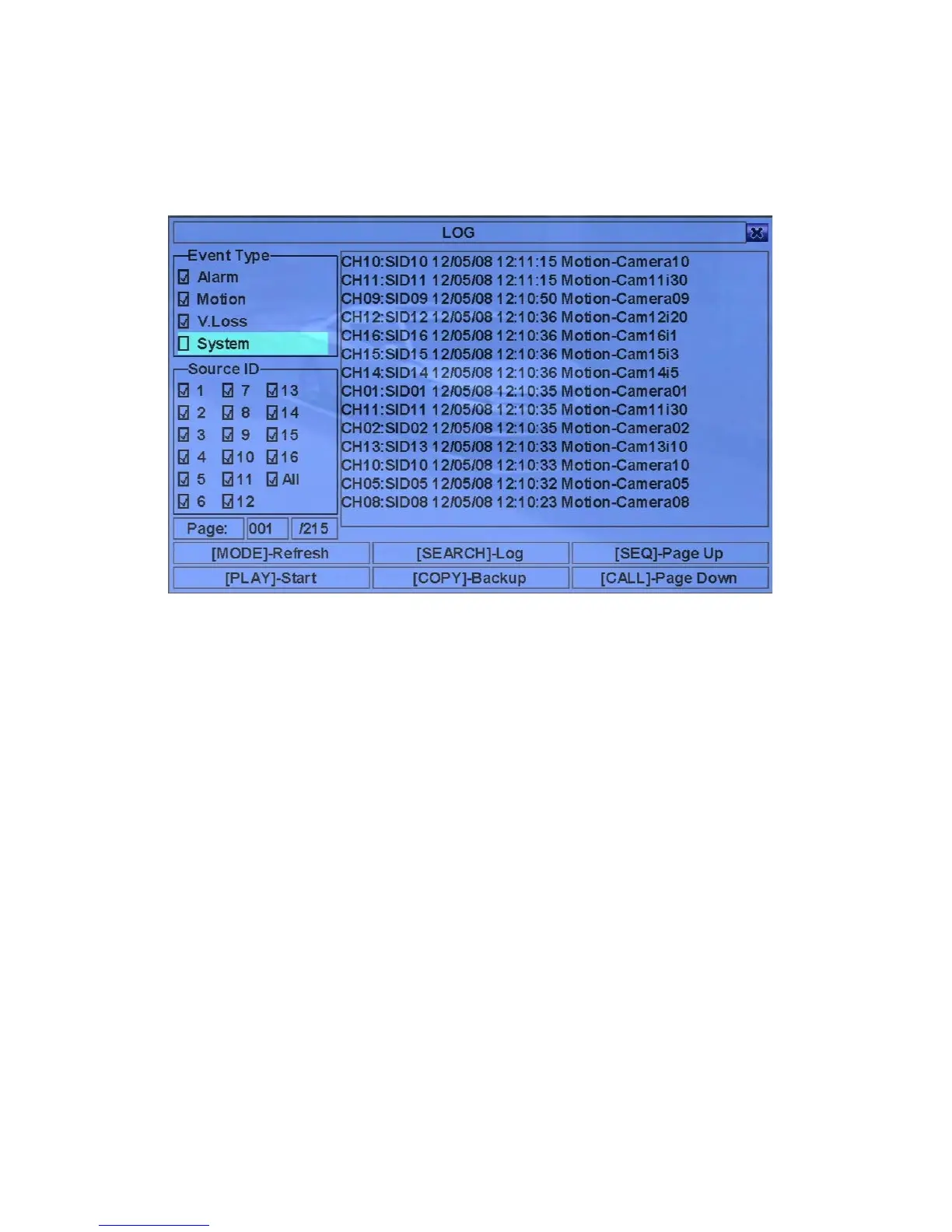 There are four different types of event logs, including Alarm, Motion, Video Loss,