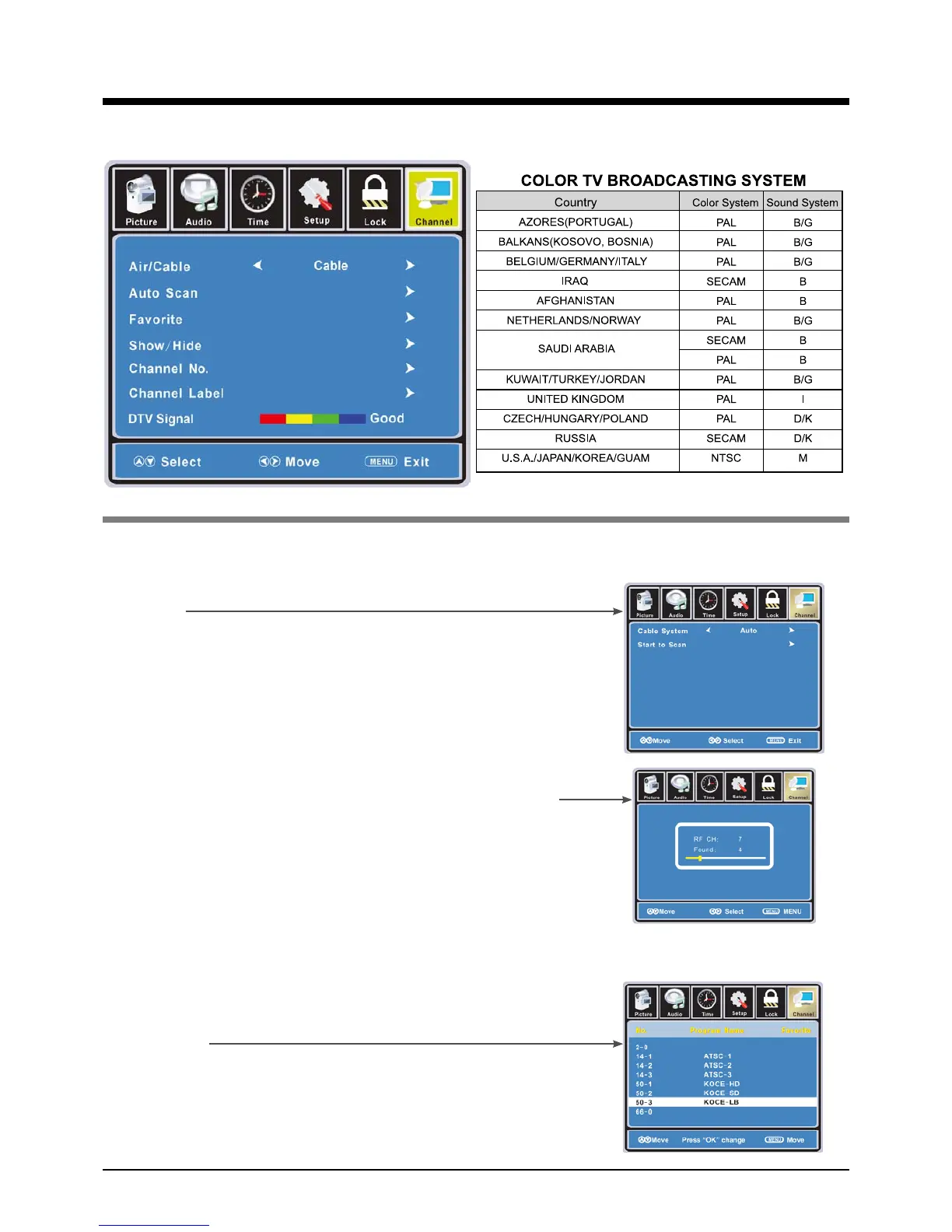 If you selet “Cable”, the following items(Favorite, Show/Hide, Channel NO, Channel Label