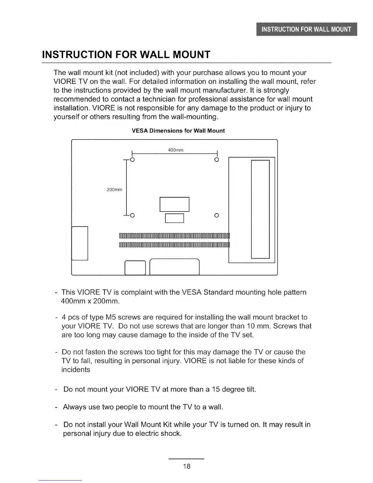 - Do not mount your VIORE TV at more than a 15 degree tilt.