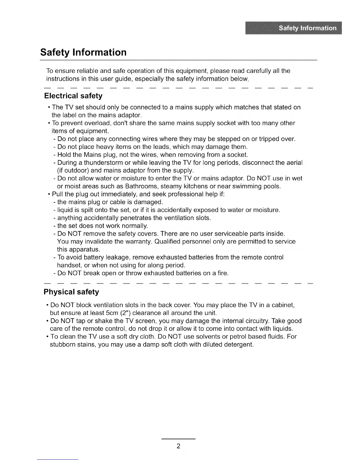 - Do not allow water or moisture to enter the TV or mains adaptor. Do NOT use in wet