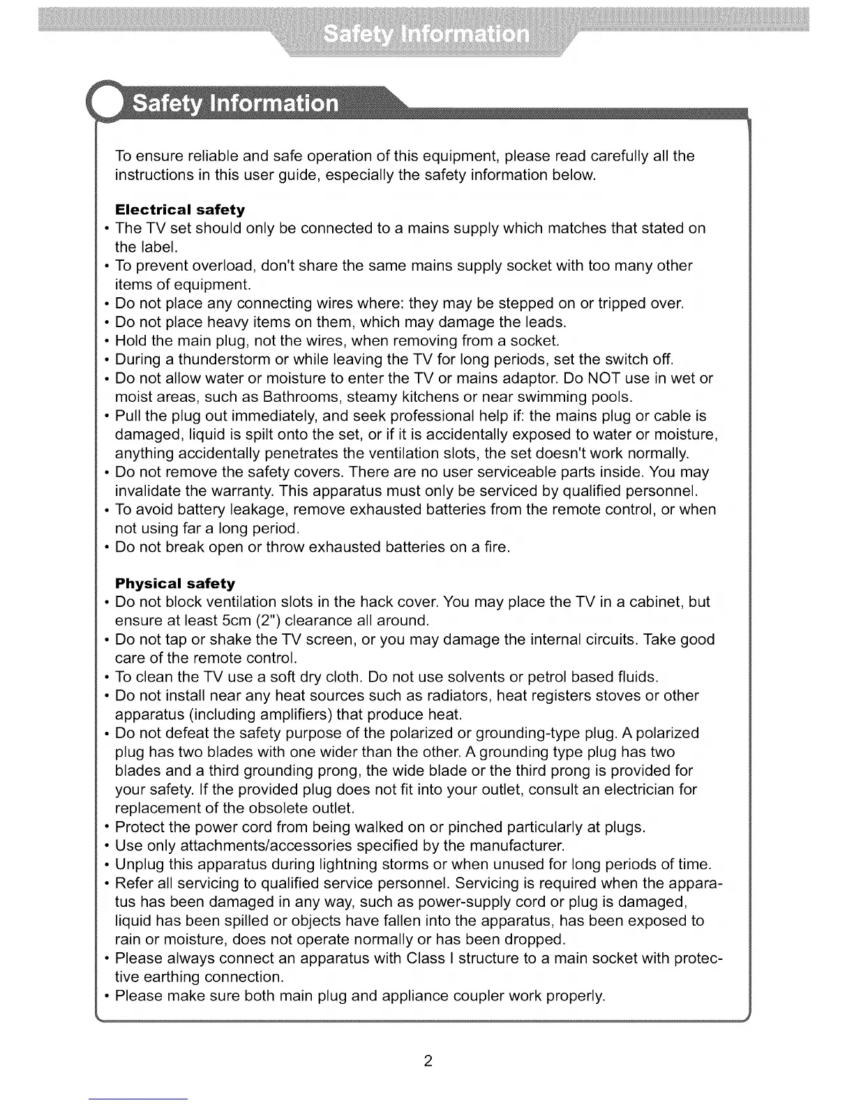 • The TV set should only be connected to a mains supply which matches that stated on
