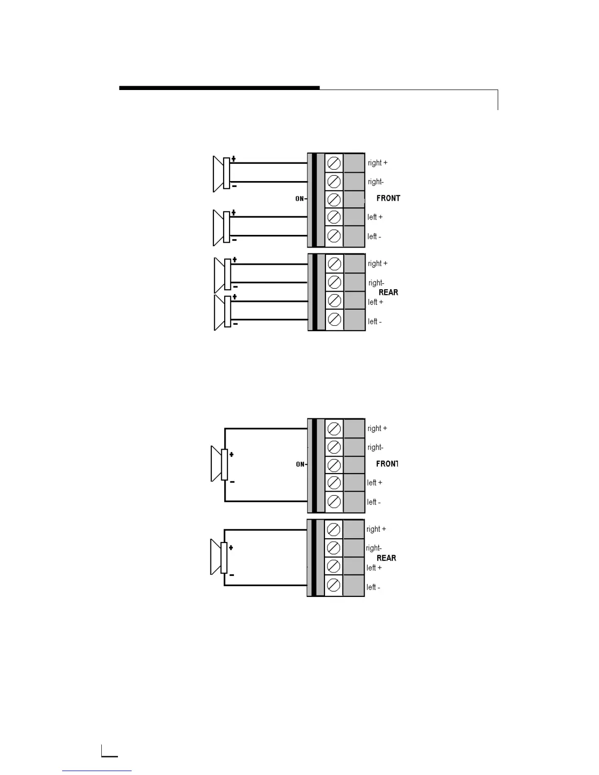 For bridged two-channel operation as shown below, connect the right channel RCA cables to the Front inputs of the