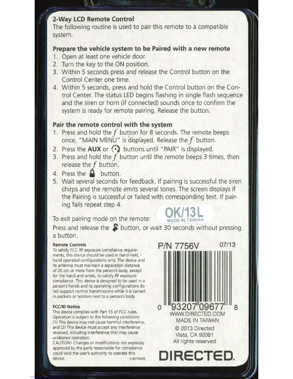 Viper 7756 - Prepare Vehicle System for Pairing; Pair Remote Control with System; Exit Remote Pairing Mode; Remote Control Regulatory Information