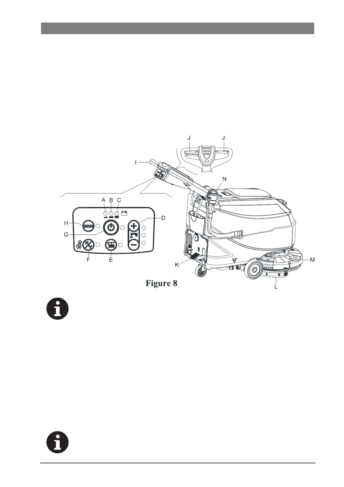 2. Push the machine to the area to be cleaned, by pushing it with the hands on the handlebar (I, Figure 8).