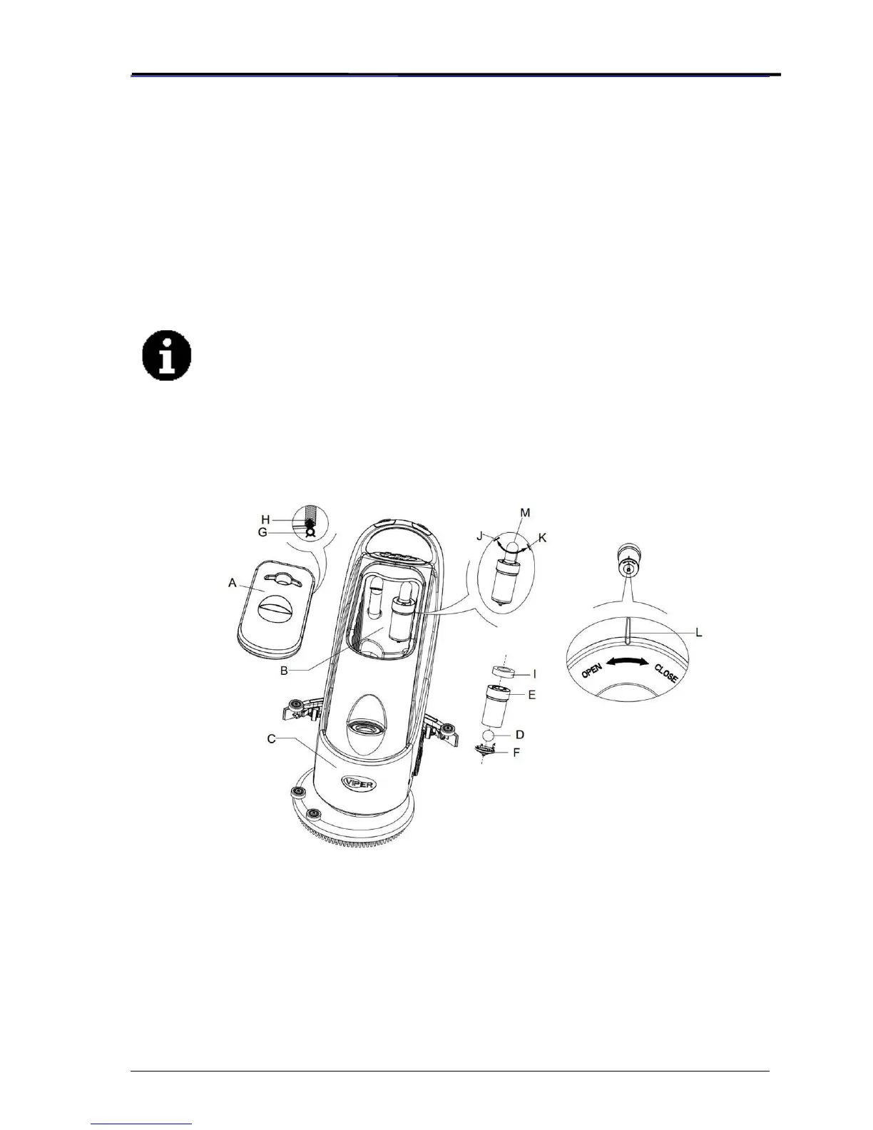 lid (F) of the float filter and clean the float (D), float filter support frame (E), and the filter sponge