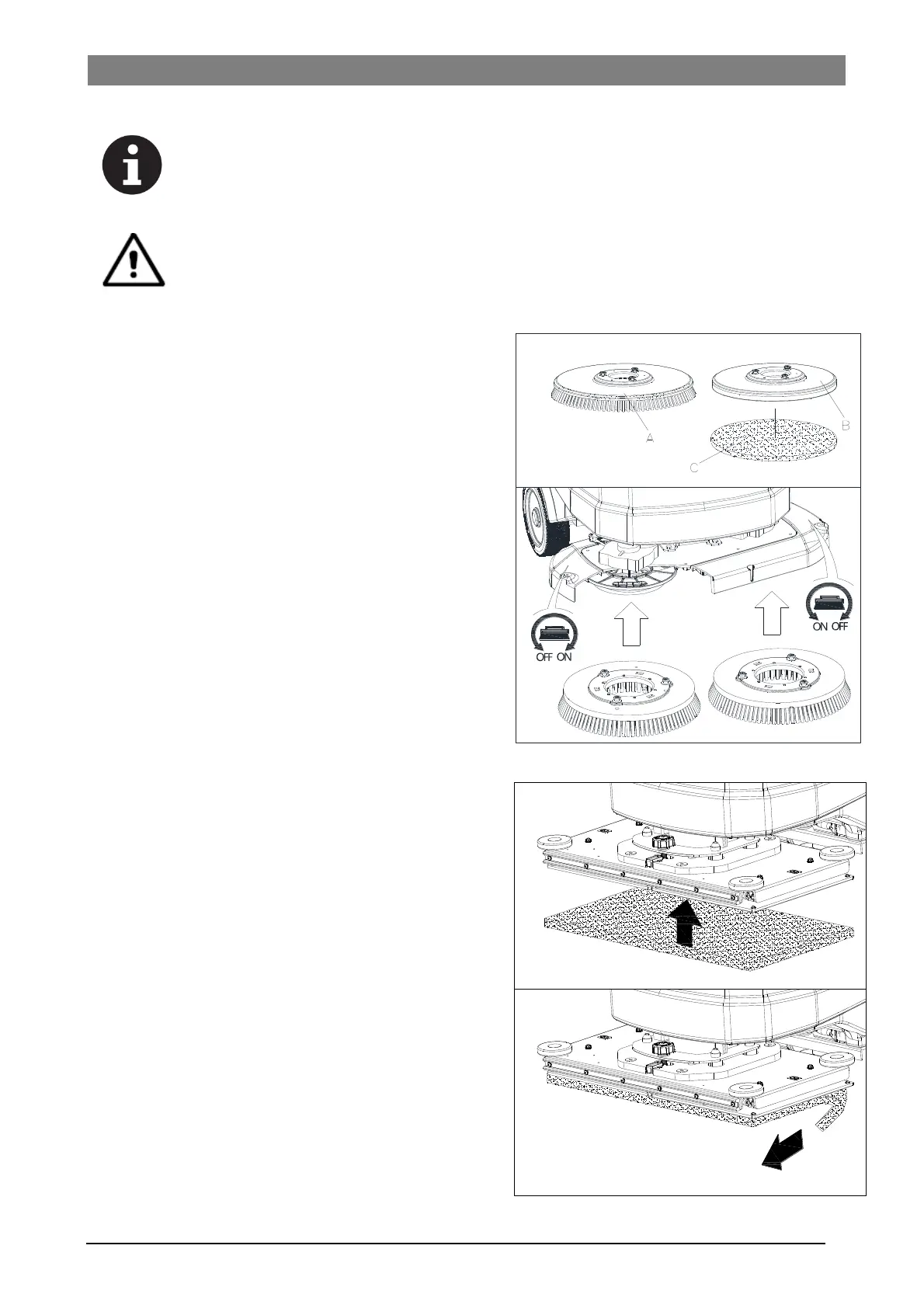 Installer soit la brosse (A, Figure 9) ou le support de disque (B et C, Figure 9) selon le type de sol à nettoyer.