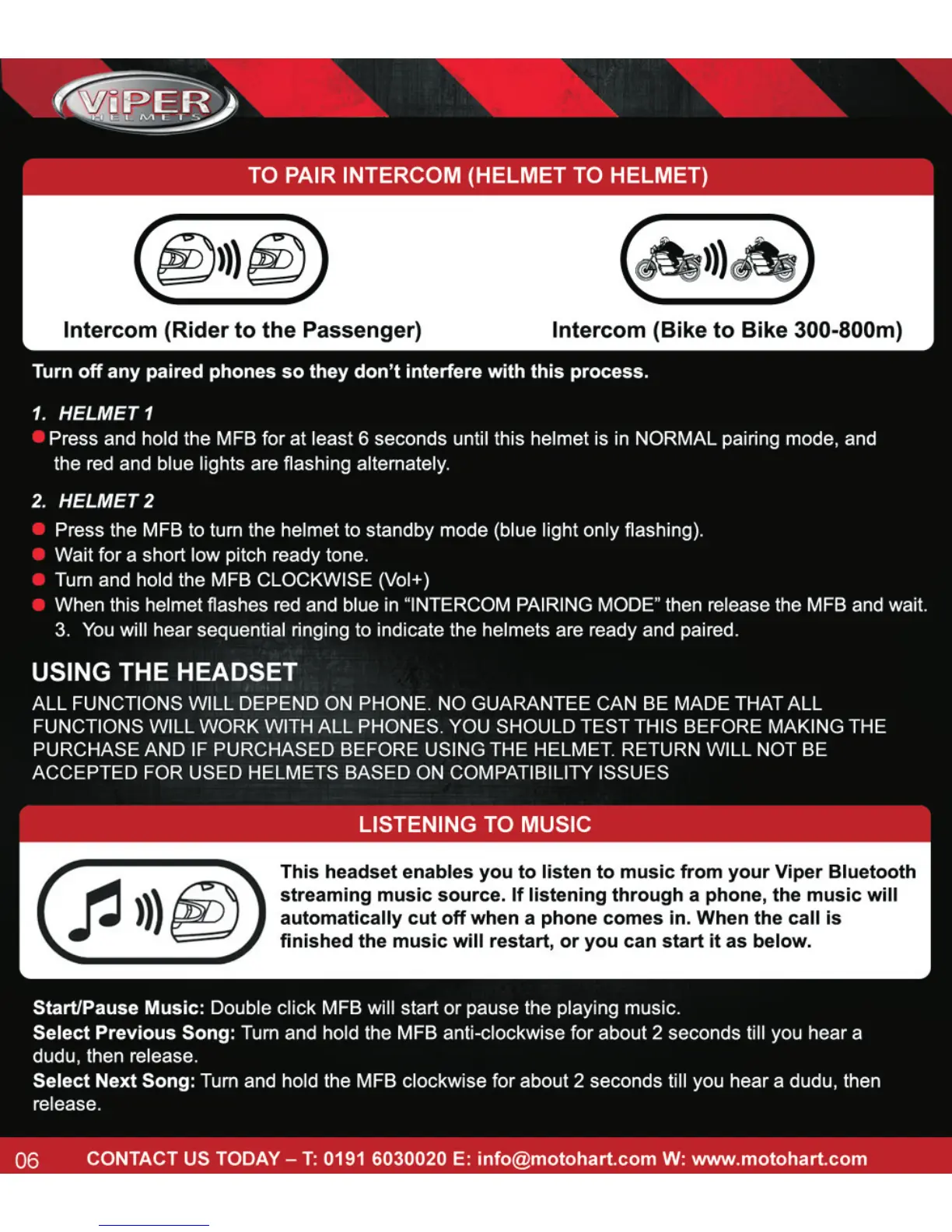 Viper BL+ - Advanced Features; Intercom Pairing (Helmet to Helmet); Listening to Music