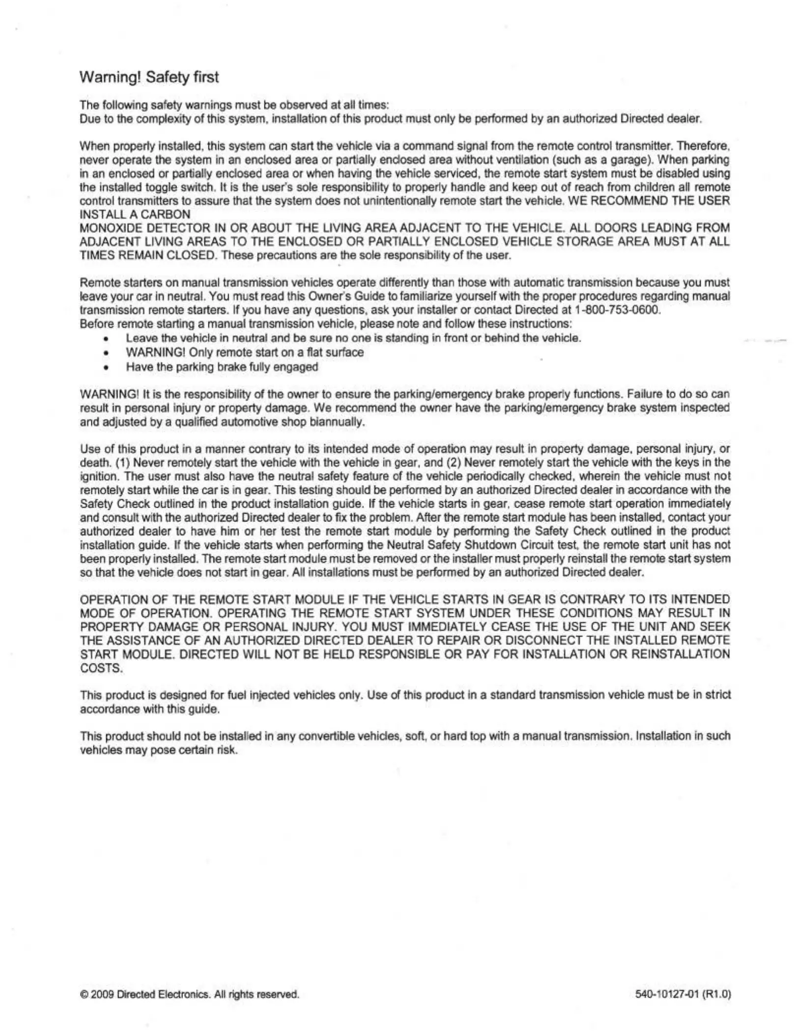 transmission remote starters. If you have any questions, ask your installer or contact Directed at 1-800-753-0600.