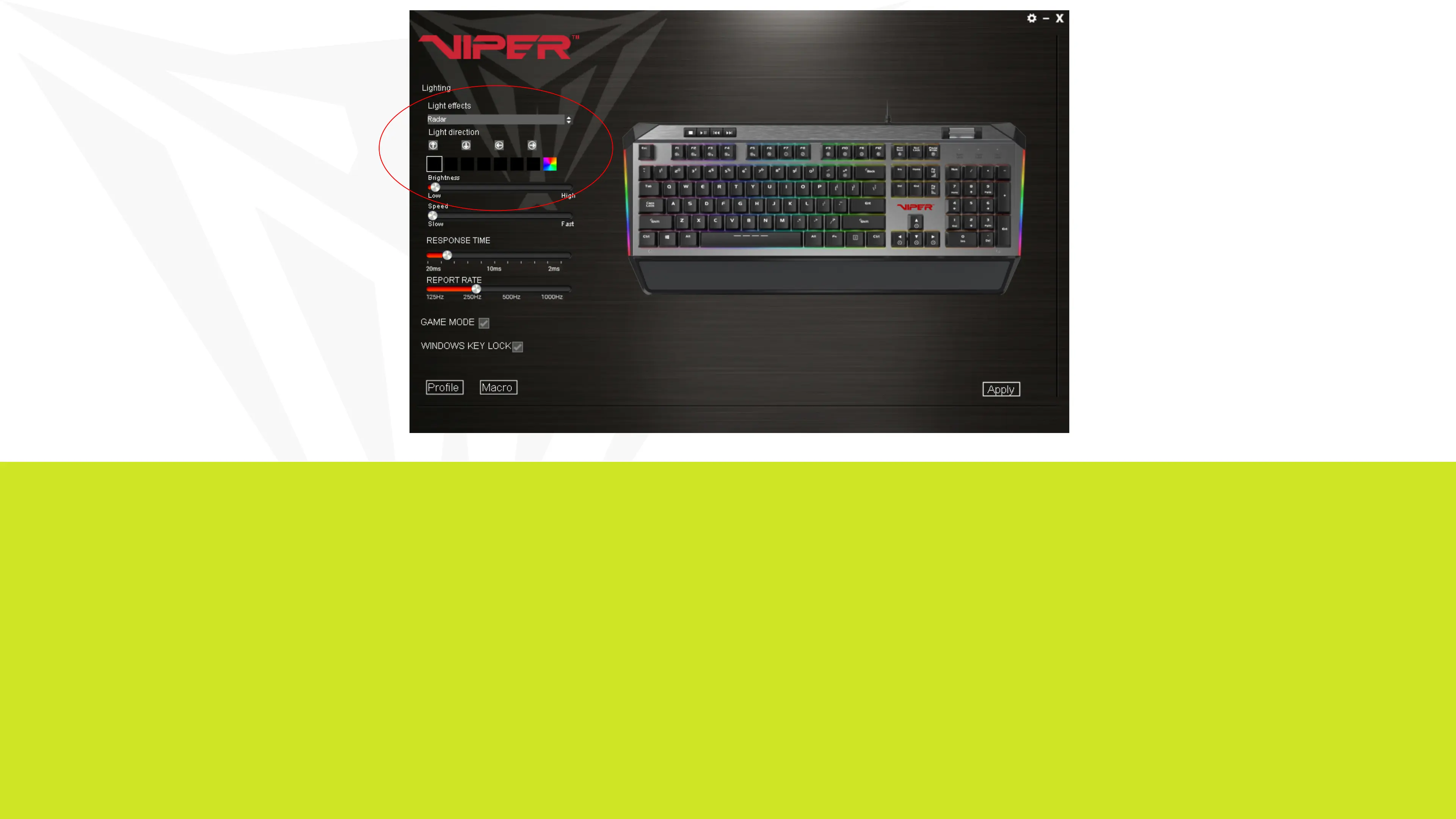The V765’s light effects can be set from the Viper software by selecting the effect from the drop down menu.