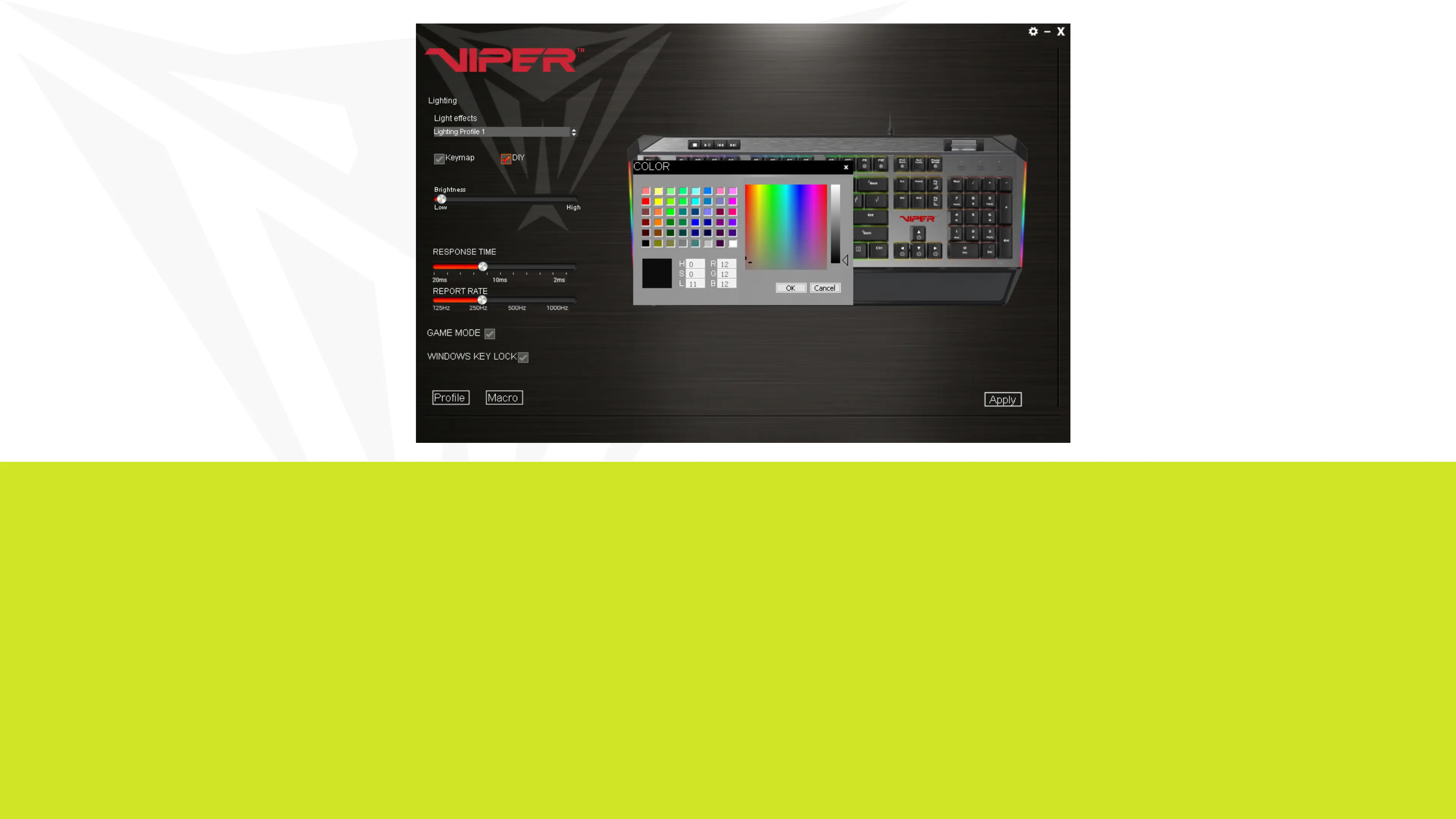 Select a key or select a group of keys and choose a color from the color pallet. Click OK, and then Apply to change and