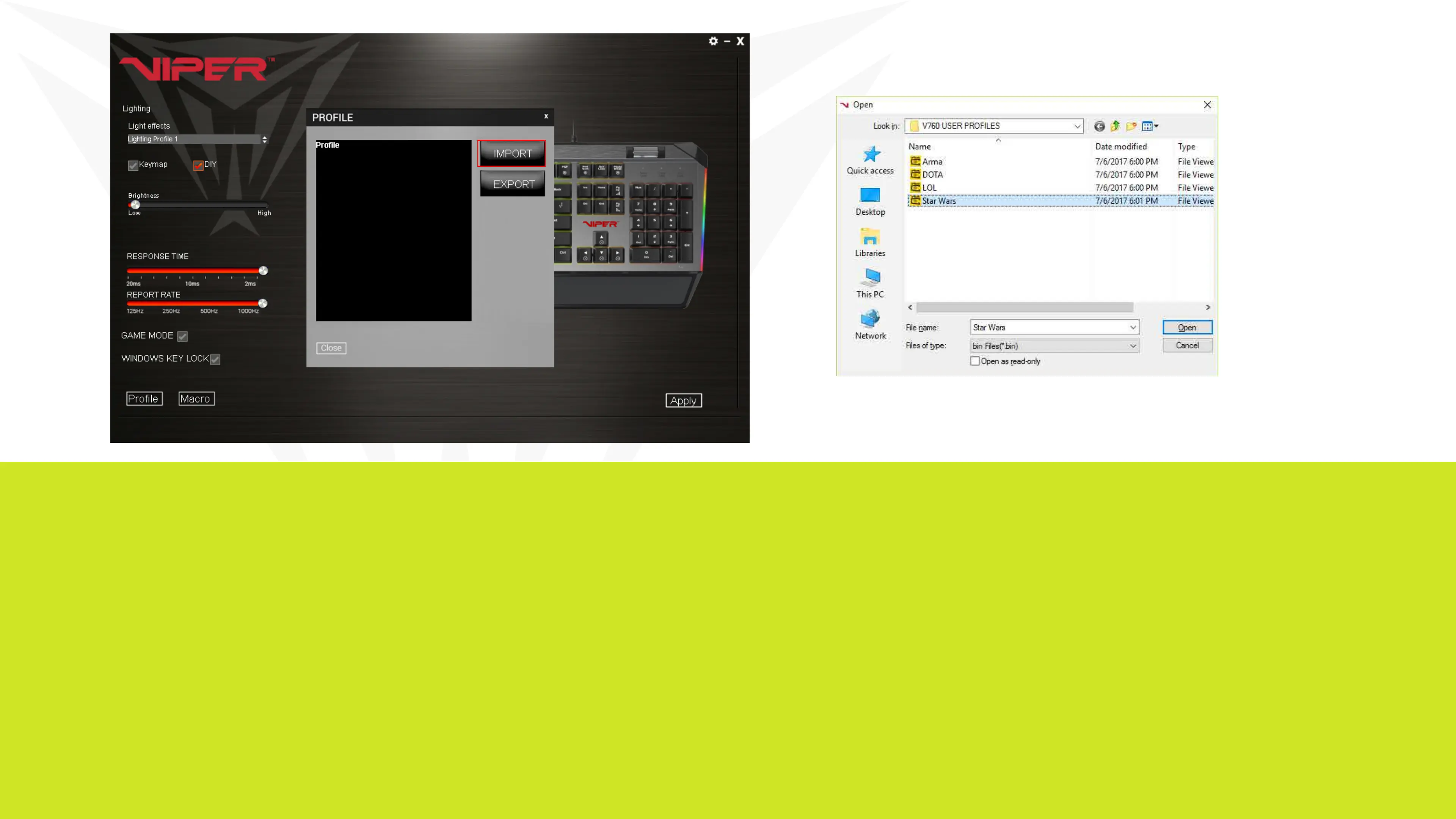 IMPORT/EXPORT screen, hit Apply. The profile is now loaded onto the
