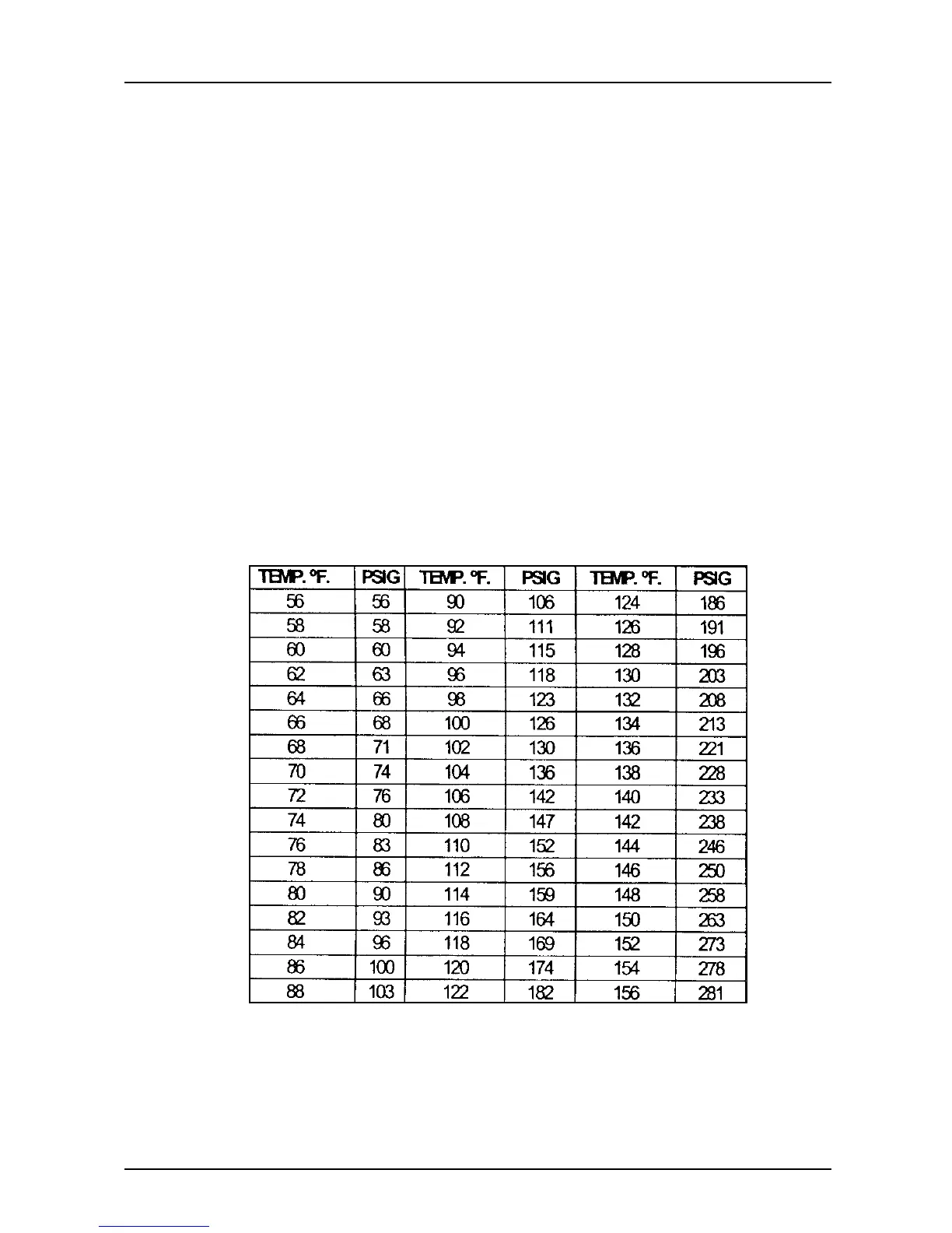3. Buscar la temperatura de la bombona en la columna TEMP ºF; luego, leer la PRESIÓN