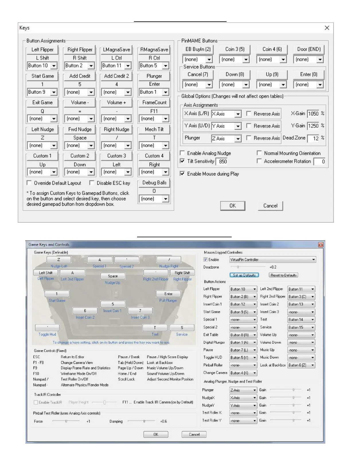 VirtuaPin Plunger Kit - Configuration for Visual Pinball; Button Assignments; Axis Assignments; Analog Nudge and Tilt