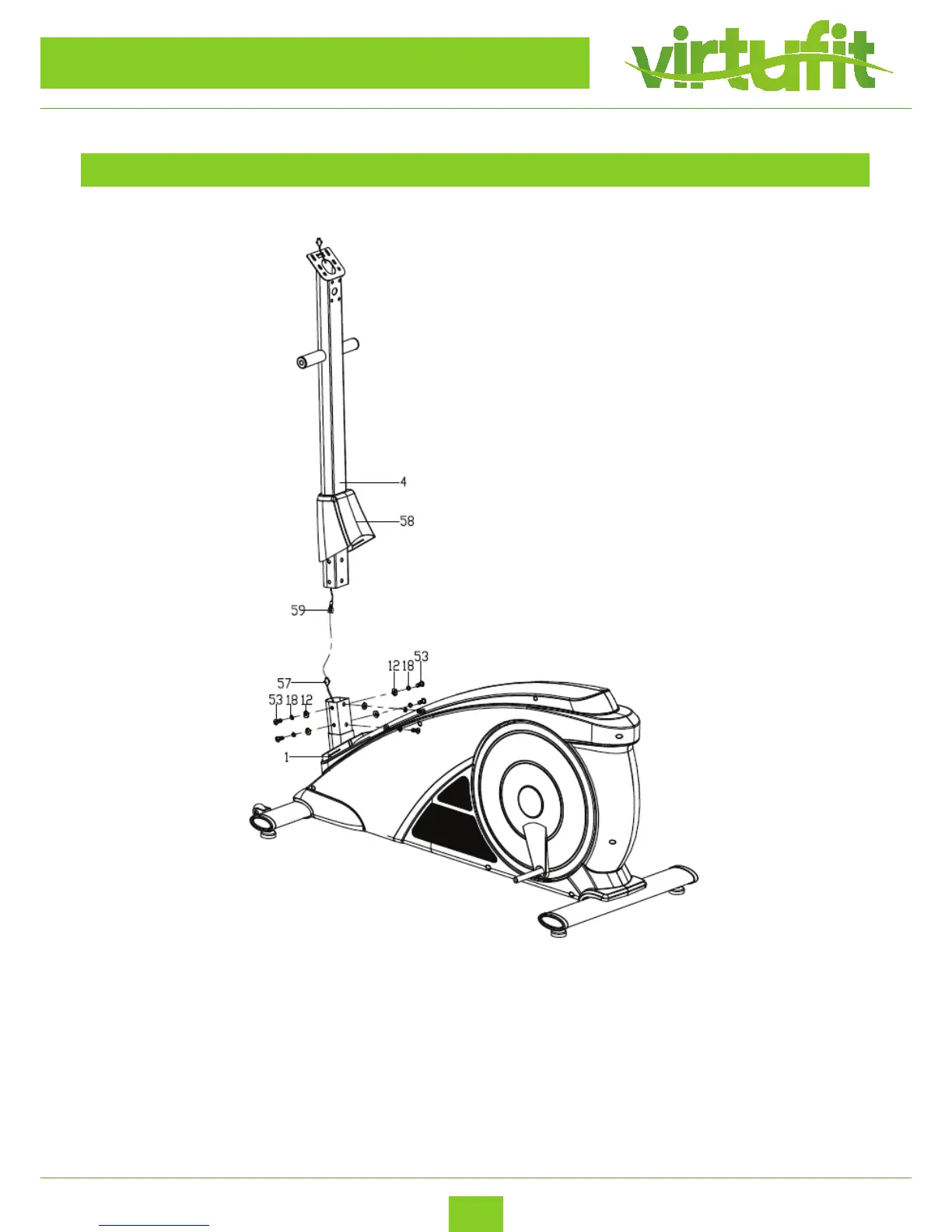 Handlebar post (4) onto the Main frame (1) with the Allen bolts (53), Spring washers (18) and Flat
