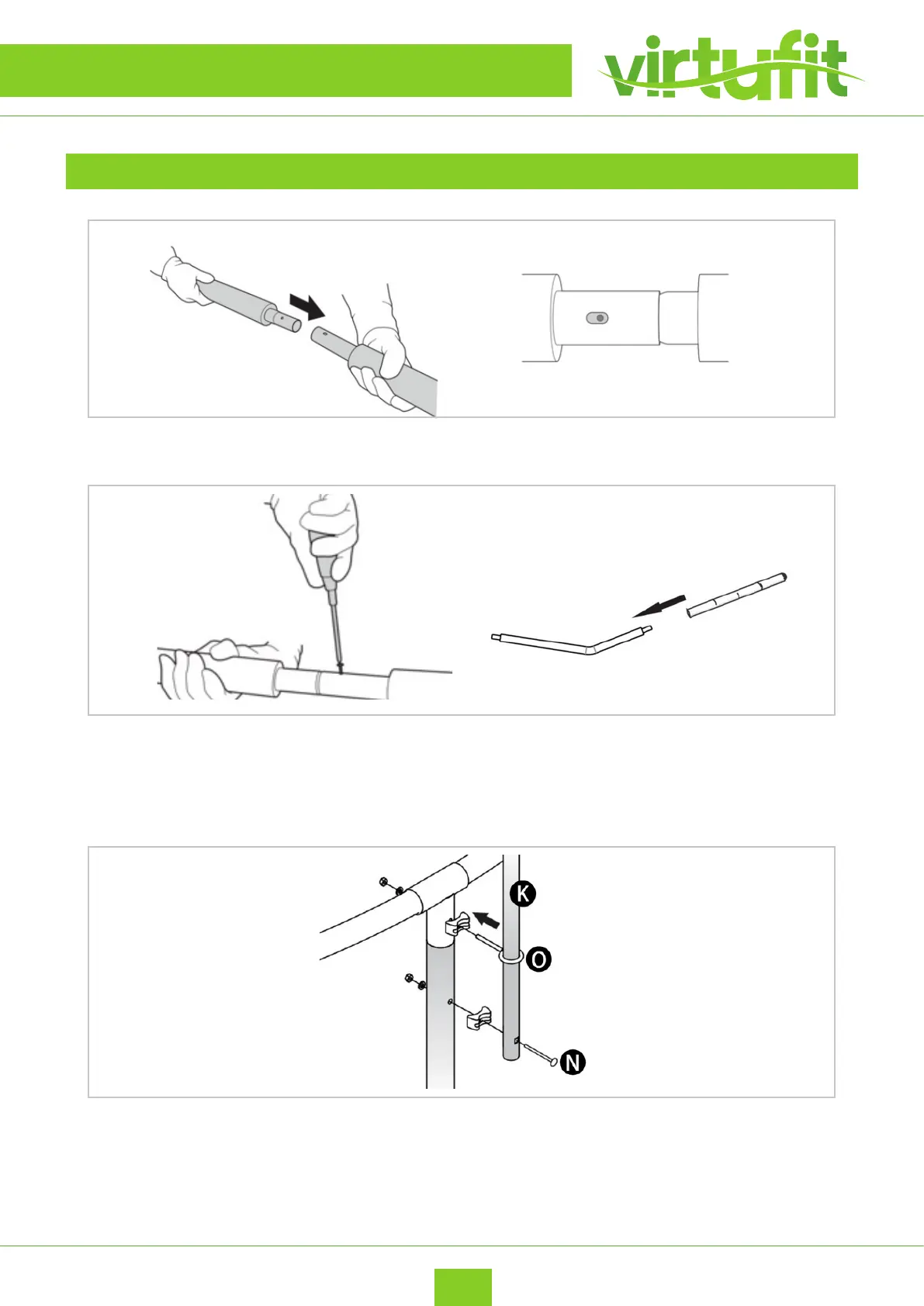 • Fixing on bottom pole tube (K) onto trampoline legs with fork screw (N) and 9 shape screw (O) as