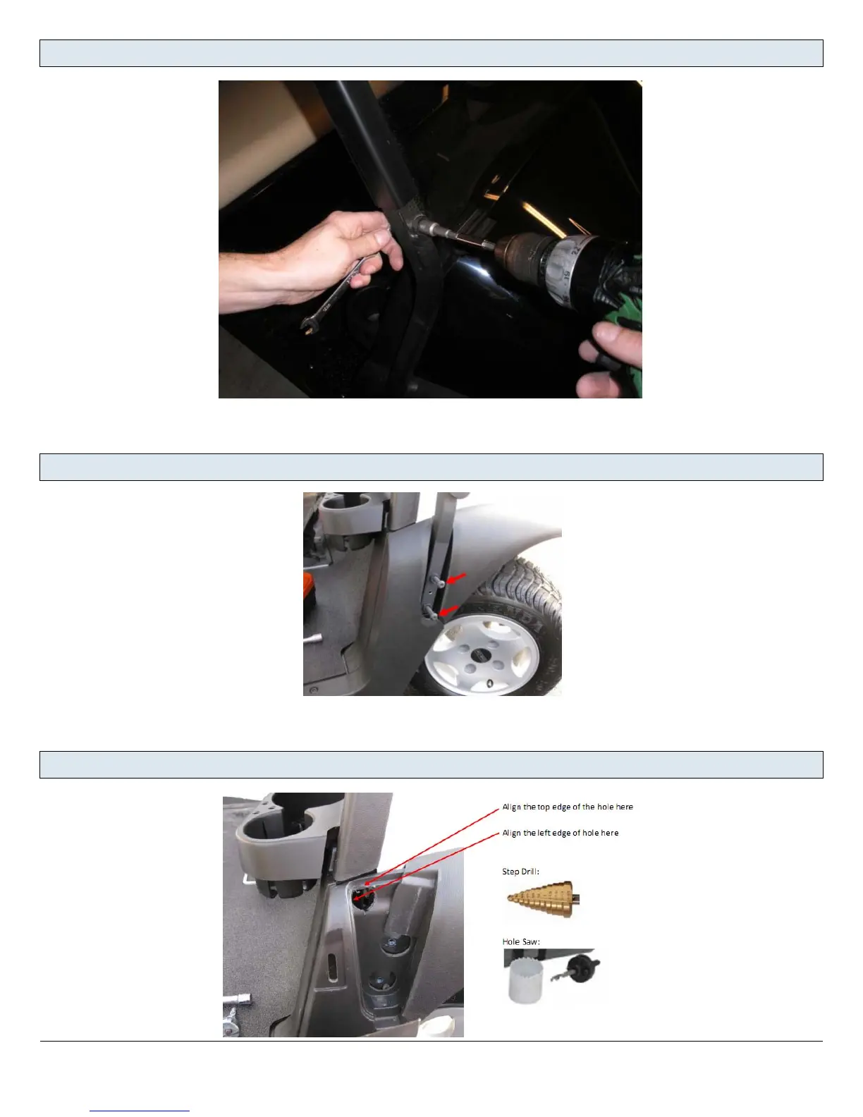 Pull the plastic fender panel back and drill 1" hole in cart as shown.