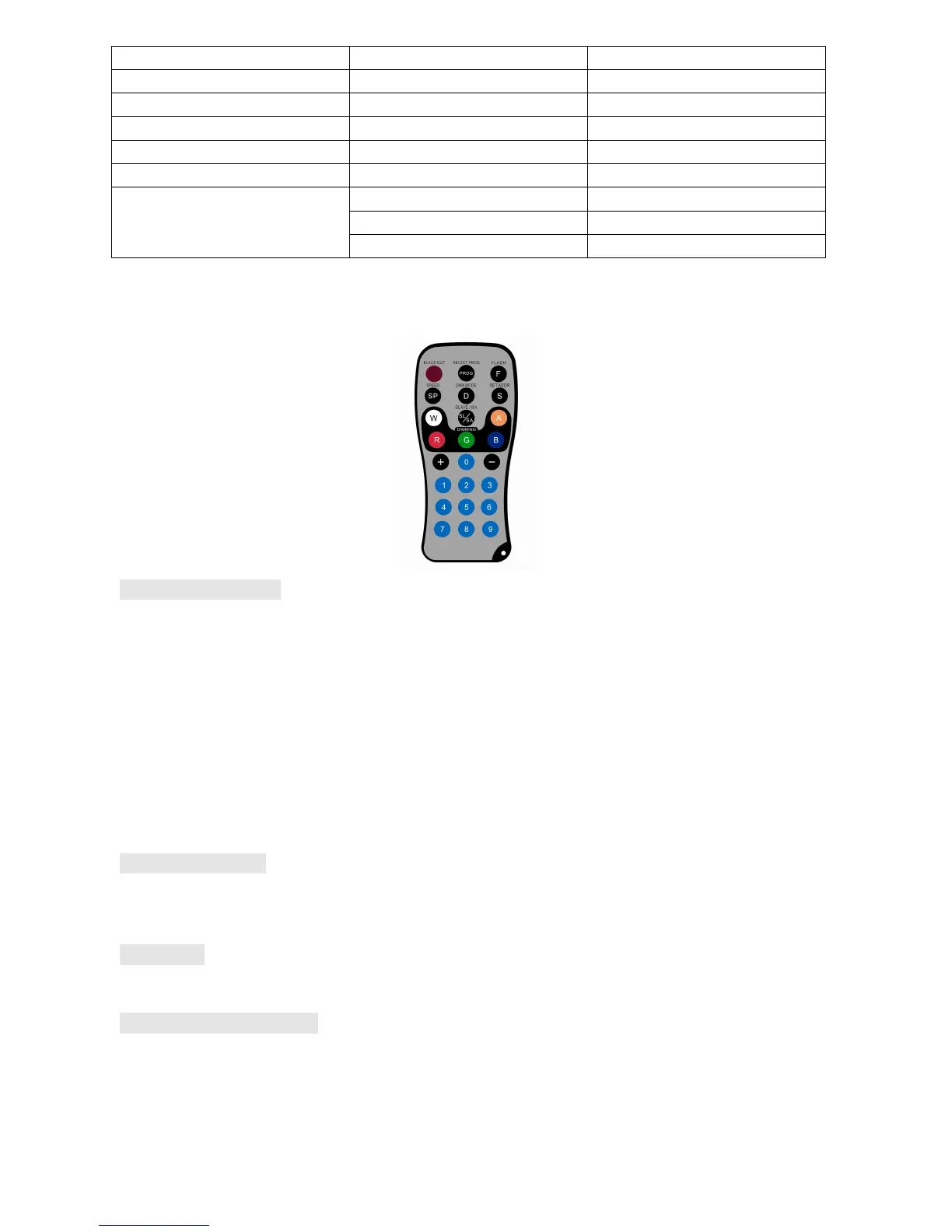 Press R/G/B/W/A to choose R/G/B/W/A colours, pressing “+” and “-” buttons to adjust the intensity of the