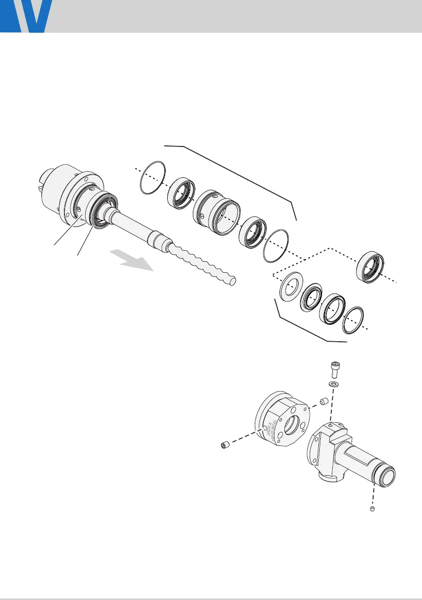 • Pull the shaft sealing units (D) and (E) off the rotor assembly and dismantle