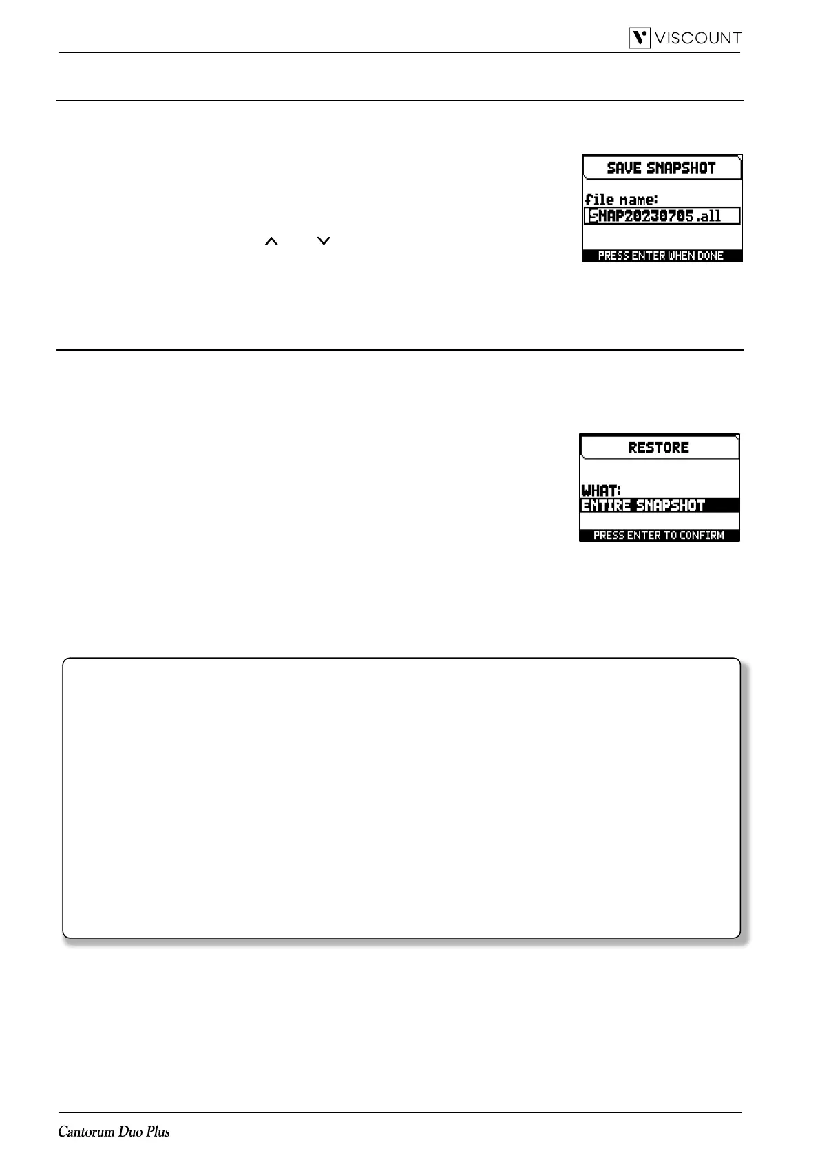 7. press [MENU/ENTER] button to confirm the load and wait the reboot of the organ (if ENTIRE SNAPSHOT,
