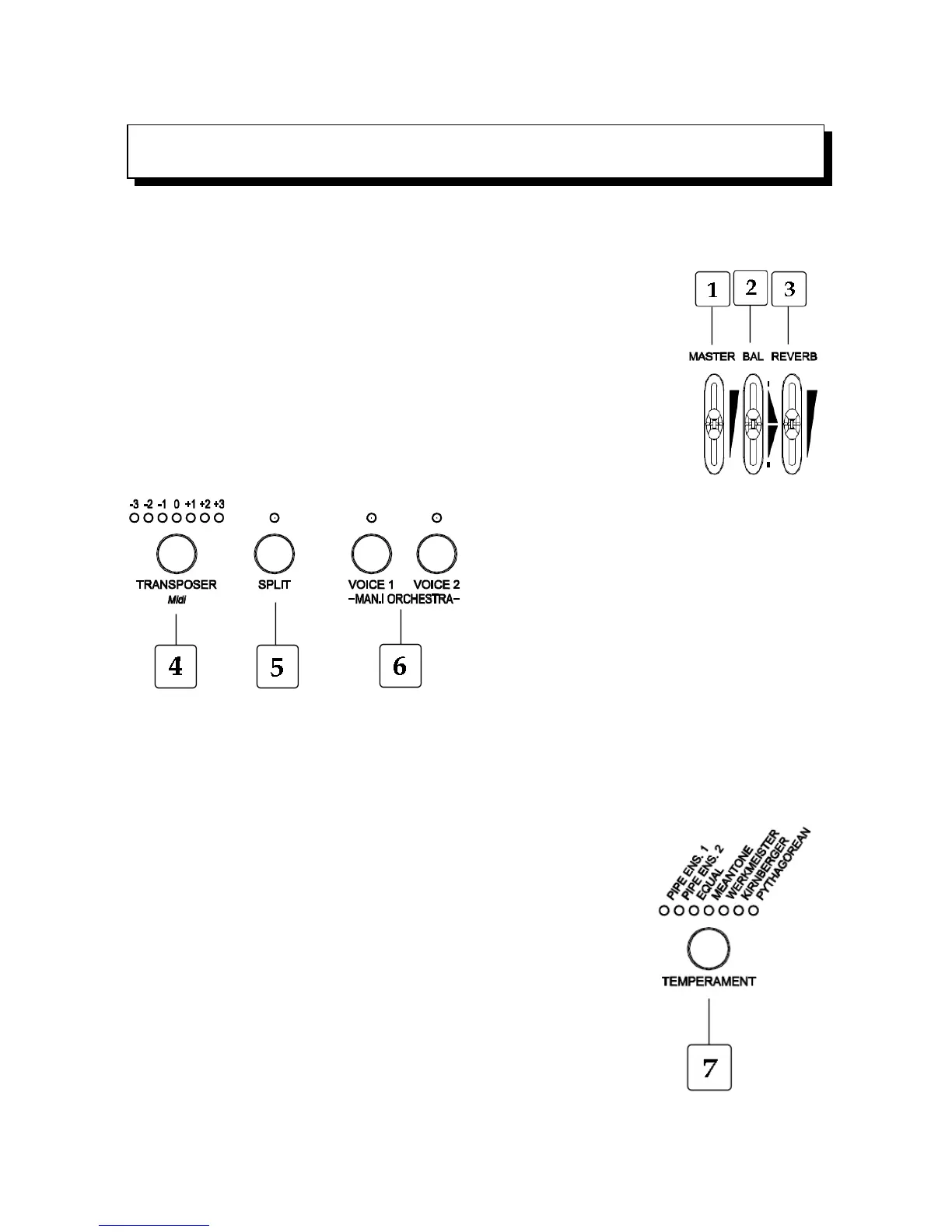 2.[BAL]: Reguliert die Lautstärke des linken (Bass und Manual I) und des