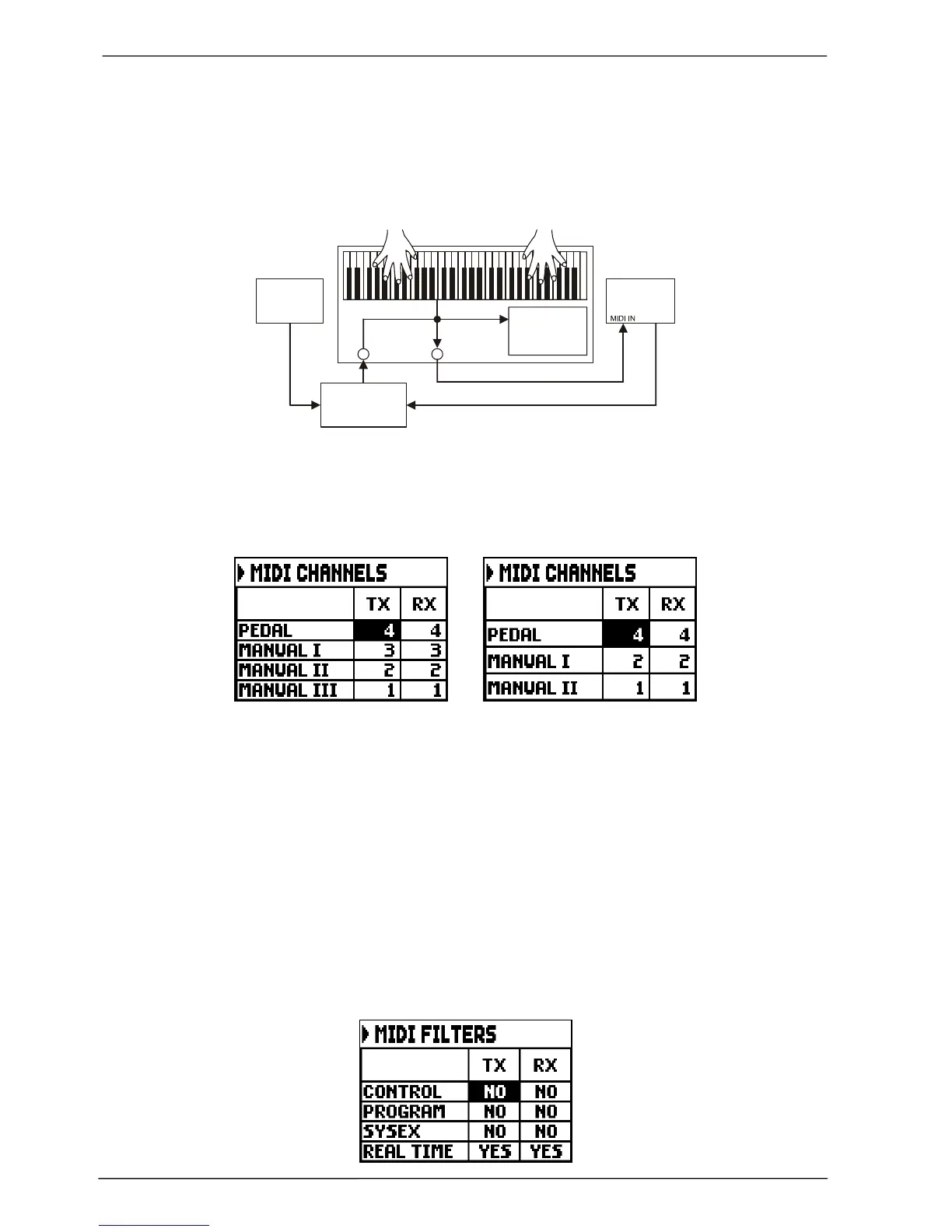 The organ can send out and receive MIDI messages on a single channel for each section. To set the MIDI