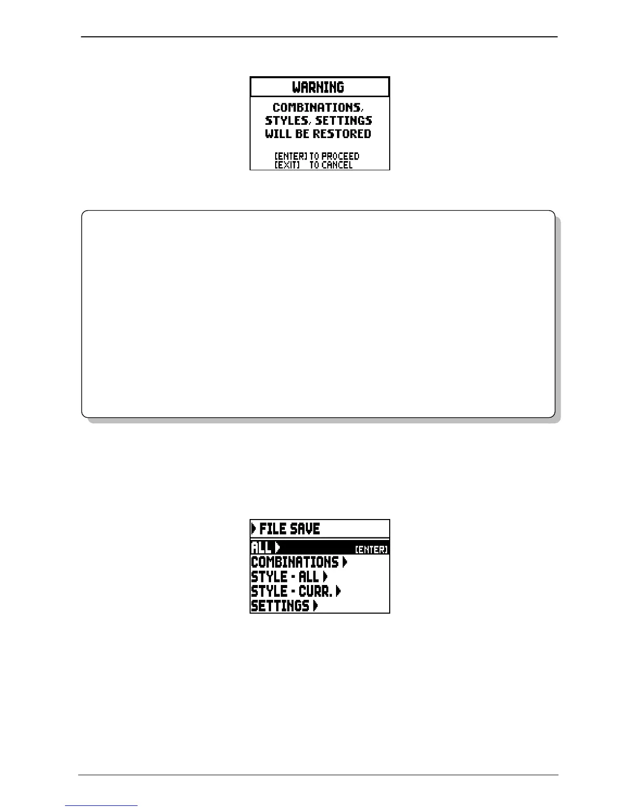 combinations, Styles etc.) currently in use on the organ will be lost. To avoid it, it is