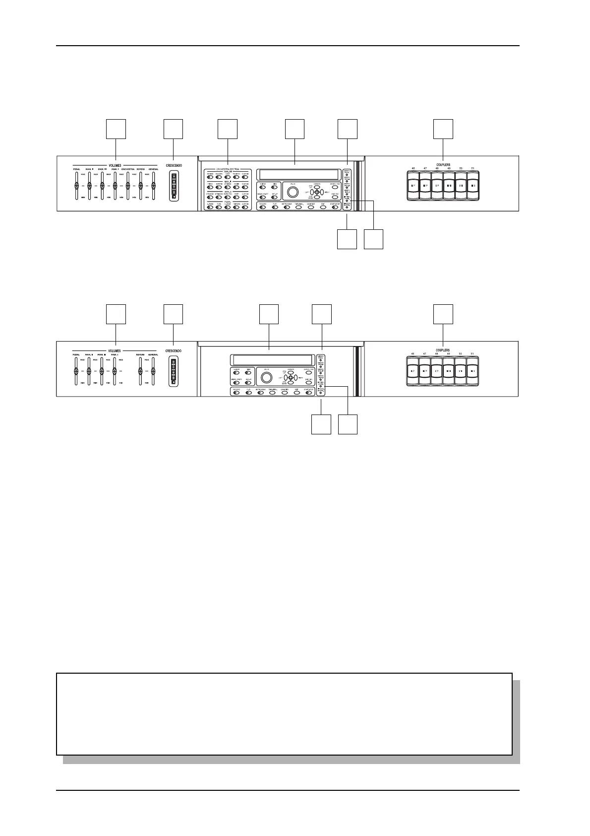 7. [VOLUMES] slider: these sliders allow you to adjust the volumes of all the organ’s sections,