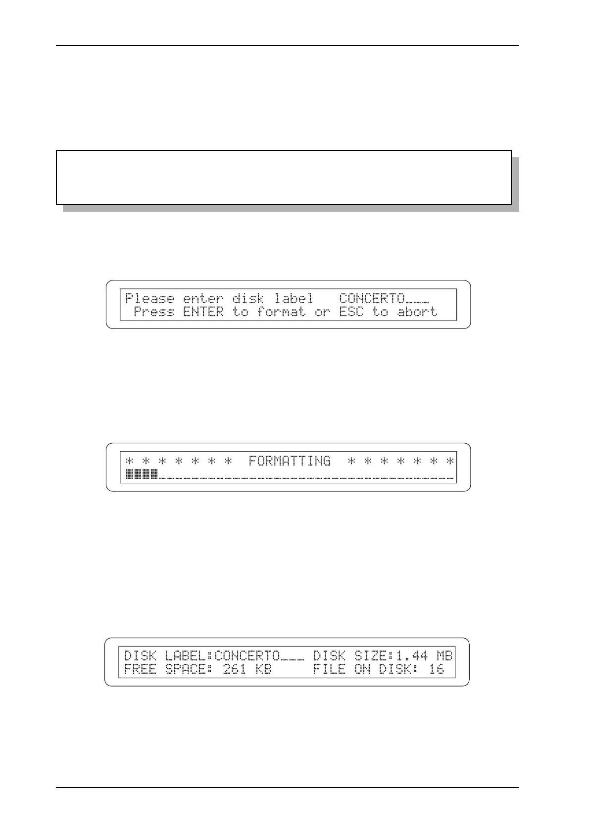 To proceed with formatting, select the FORMAT option in the DISK menu, and press [ENTER/