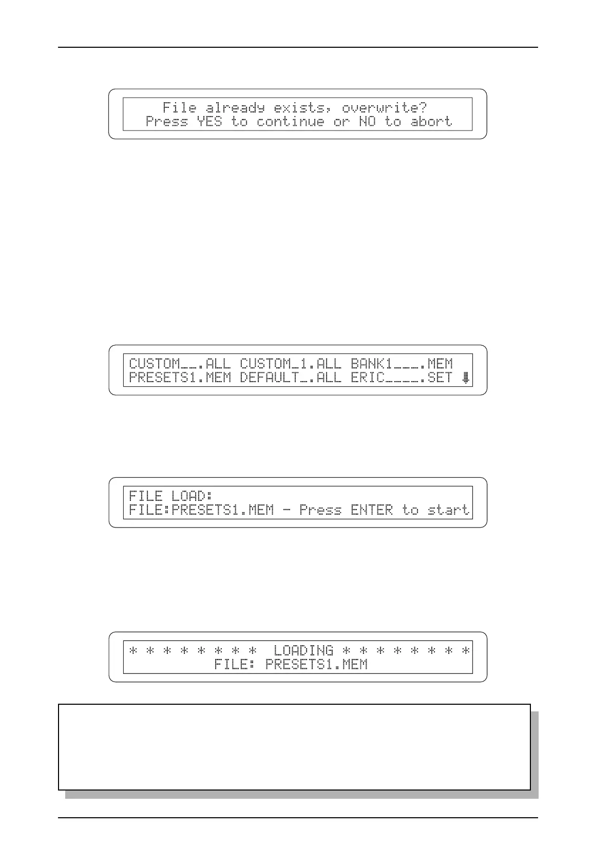 [ENTER/YES]; the display will show a confirmation prompt to avoid loading the wrong file: